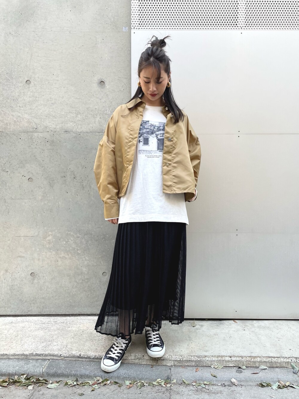 後ろが長めになっているカーキの アウターが可愛い😍 黒のスカートは透け感があって これからの季節たくさん着れそう!!!