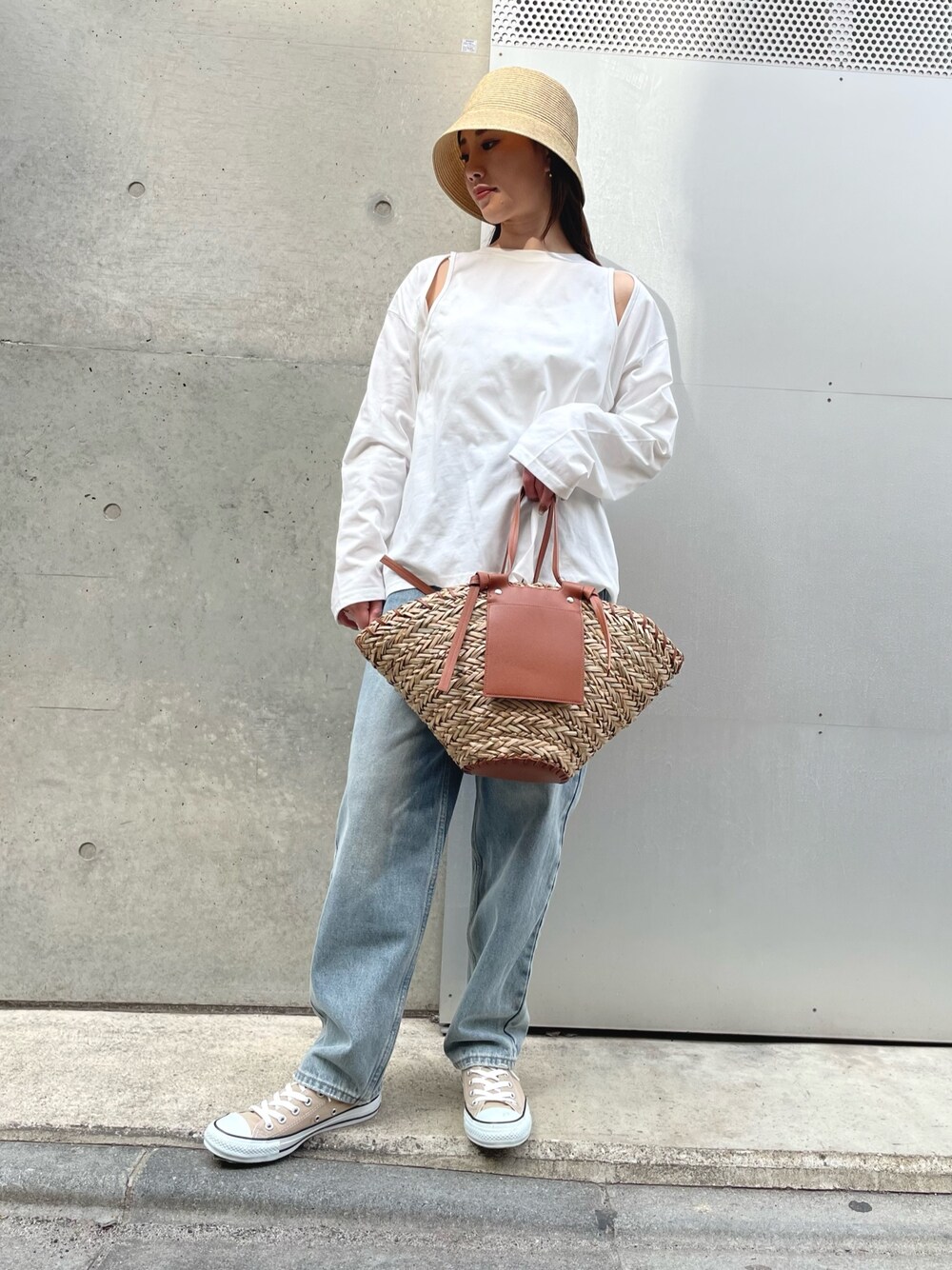 春先に着回し抜群なスタイリング! 麦のハットもバックも夏までいけるから 今年のマストアイテム入りです🌞🌈