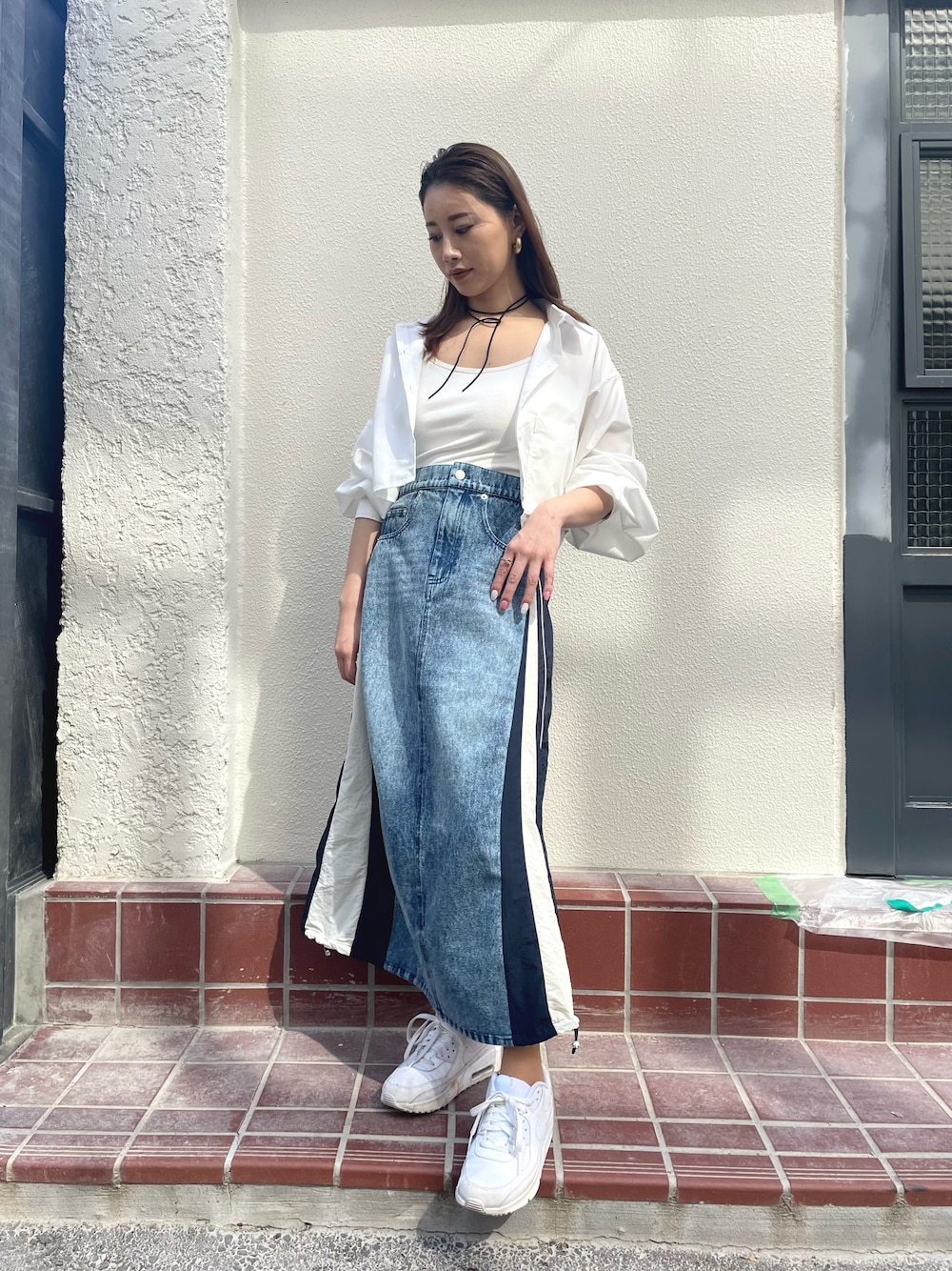 スカート切り替えが 可愛すぎてお気に入り🤩 白シャツを羽織って春意識コーデです🌸