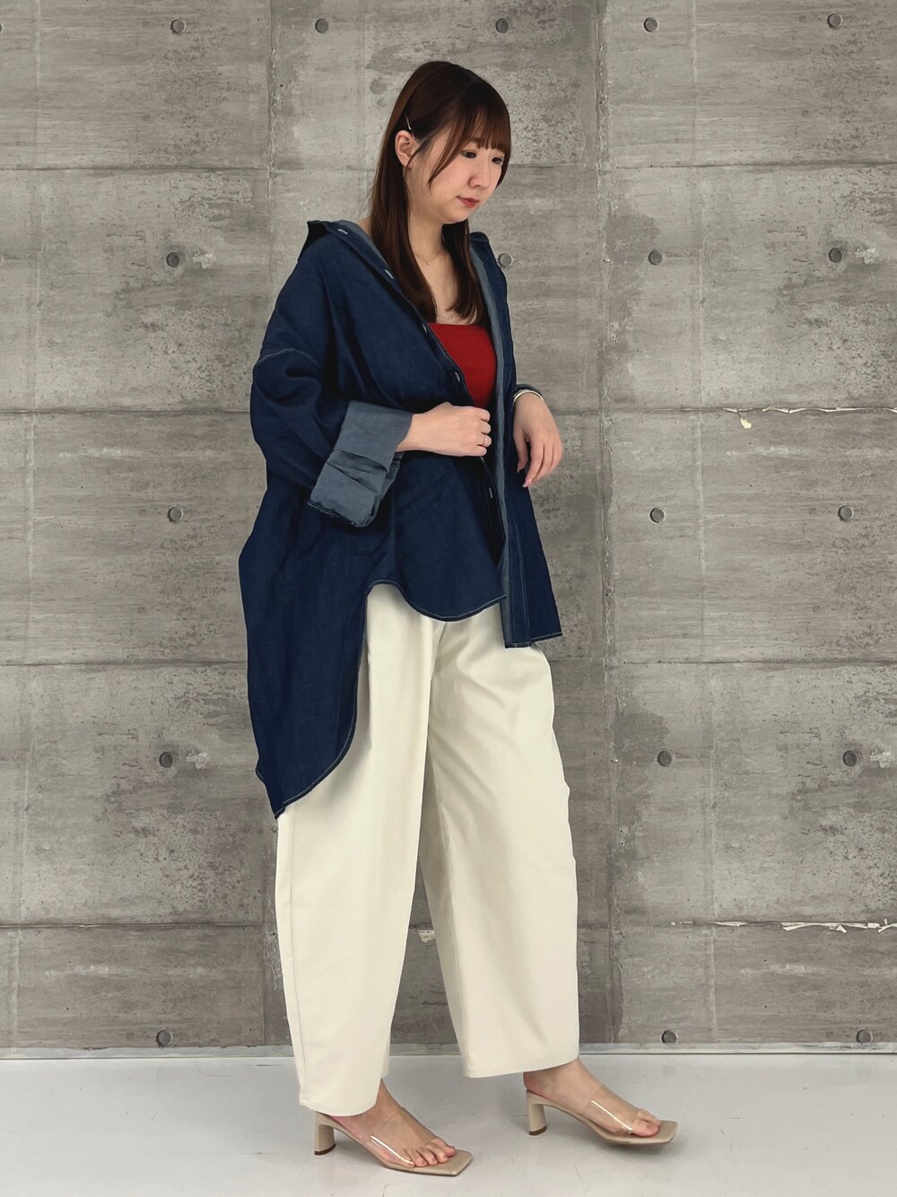 シンプルだけど存在感のある、大人のためのレイヤードスタイル。 ネイビーのロングシャツでシャープに引き締めつつ、 赤のインナーをチラ見せして、ほんのり色気と遊び心を。 ボトムはあえてリラックス感のあるワイドパンツを合わせて抜け感を意識。 足元はクリアヒールで、程よい抜け感と女性らしさをプラスしました。 頑張りすぎないけど、きちんと感は忘れたくない。 そんな大人の日常に寄り添う、モードカジュアルな1コーデです。