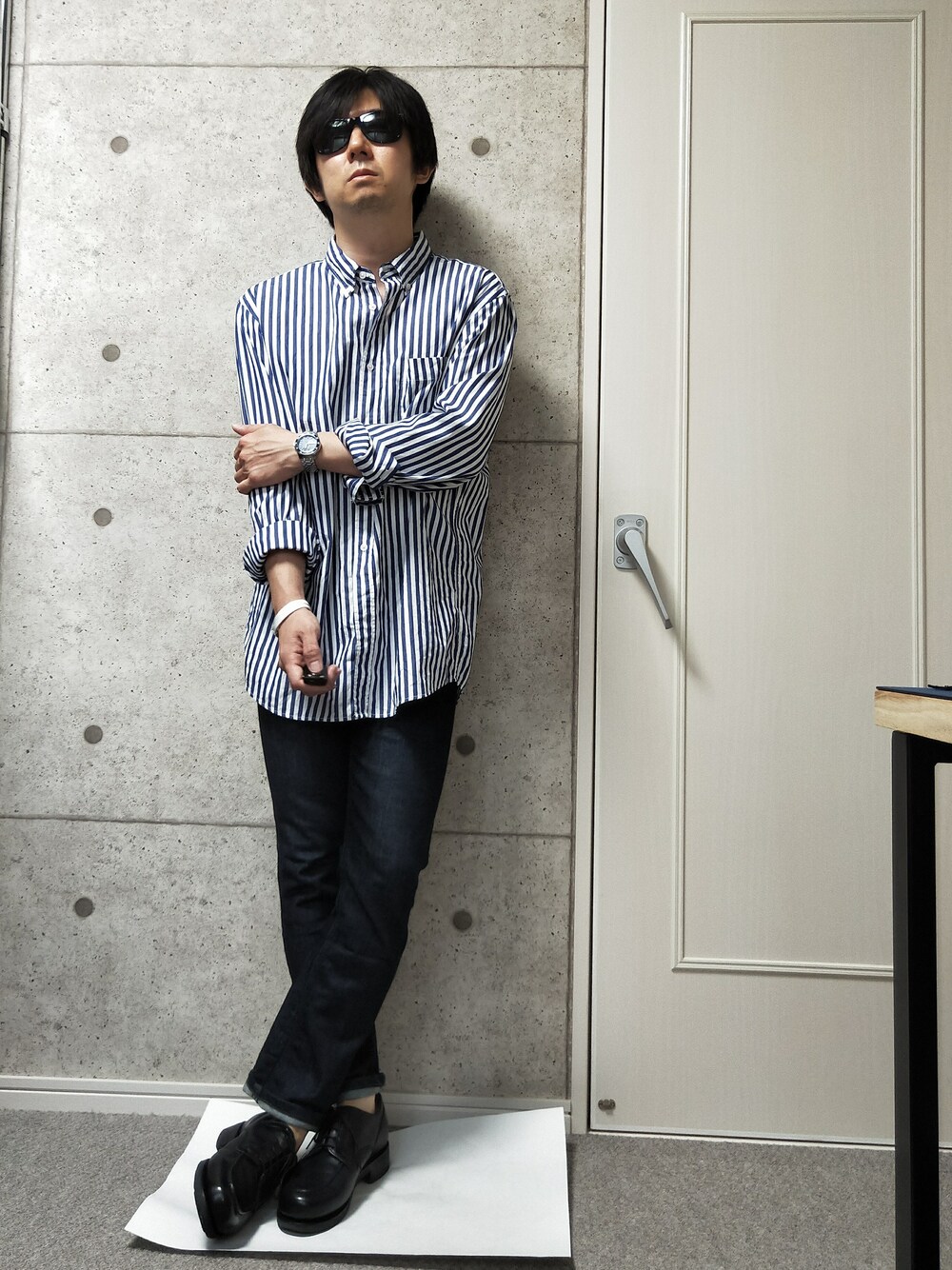 ストライプシャツに細身のデニムを合わせました。シャツのジャストサイズはSですが、こちらLサイズを着ています。ブルーデニムにパラブーツのシャンボード(ネイビー)を合わせるのがお気に入りです。