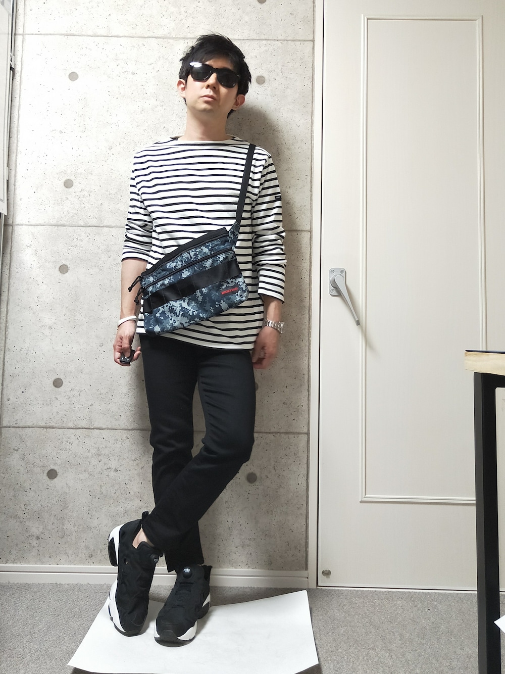 セントジェームスのボーダーにスキニーを合わせました。ボーダーと言えばこれみたいな名品だと思います。生地ががっしりしているのですが、体に馴染んでいく感じがあります。ちょっとシンプルすぎるかと思い、デジタルカモのサコッシュをつけてみました。