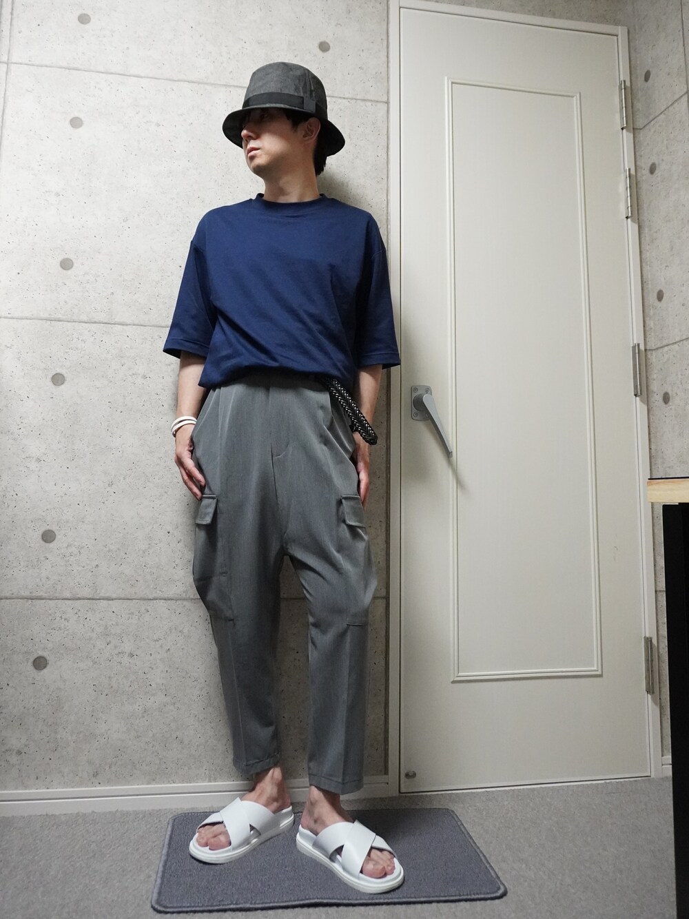 ネイビーTシャツにグレーのカーゴパンツを合わせました。 このパンツはカーゴだけどスラックスみたいな素材で、しかも形がサルエルという変化球パンツです。 Tシャツは艶々だし、パンツもスラックスみたいで艶があるので意外と落ち着いて見えるかと思ってます。