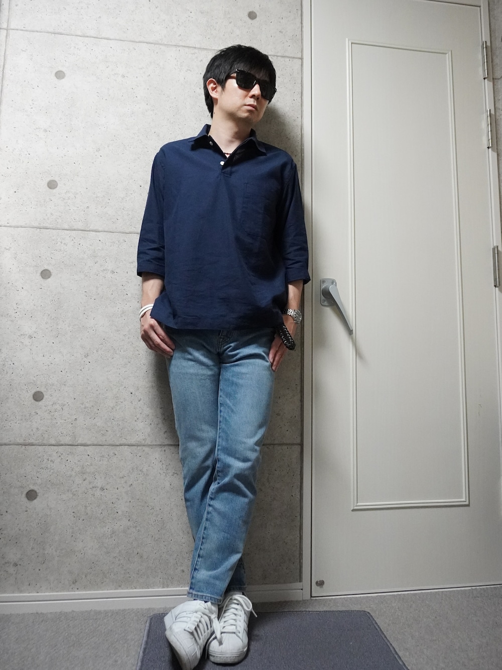 ネイビーのスキッパーシャツに色落ちのテーパードデニムを合わせました。 加工デニムって裾上げすると、裾の加工がなくなってしまうんですよね。 つなぎ合わせる方法があるみたいだけど、何か不自然な感じがしてちょっとヤダ。 このzozoのデニムは、裾の加工残してサイズが選べたのでよかったのにな〜