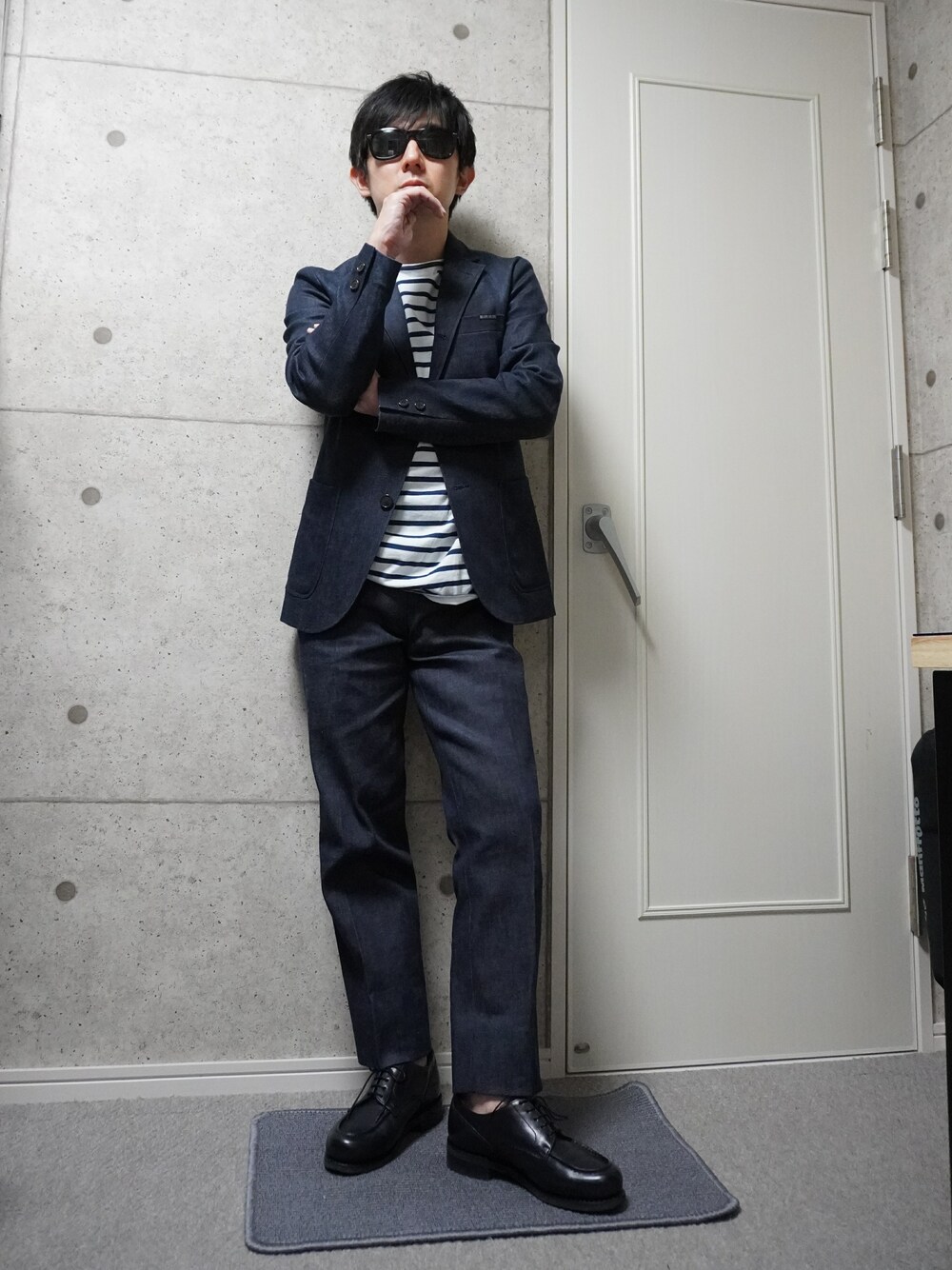 今日はちょっと涼しくなったので、デニムのセットアップにしてみました。デニムなんですがパッと見スーツです。インナーで外した感じです。