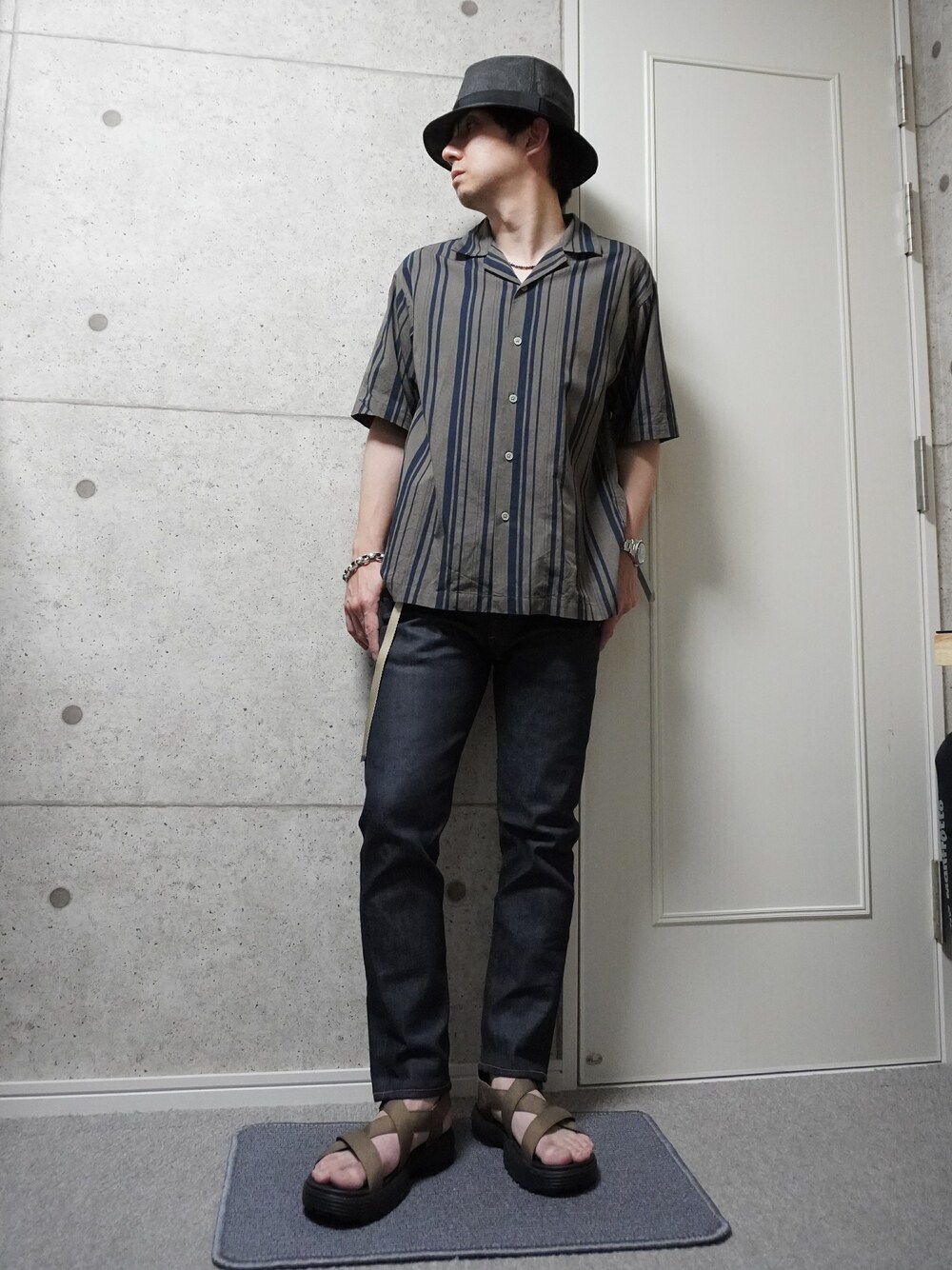 ストライプのオープンカラーシャツにスキニーデニムを合わせました。色は全体的に暗目ですが、半袖とサンダルで夏感を出しています。