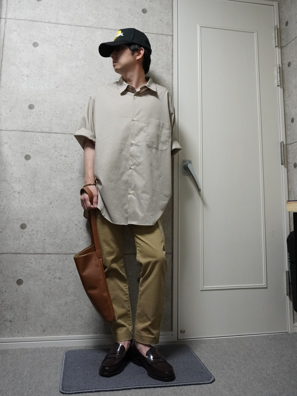 大きめの半袖シャツ(XL)に細身のチノパンを合わせました。上半身は大きめシャツとキャップで崩し気味に、下半身は細身のパンツと革靴でキレイ目にしてバランスをとりました。