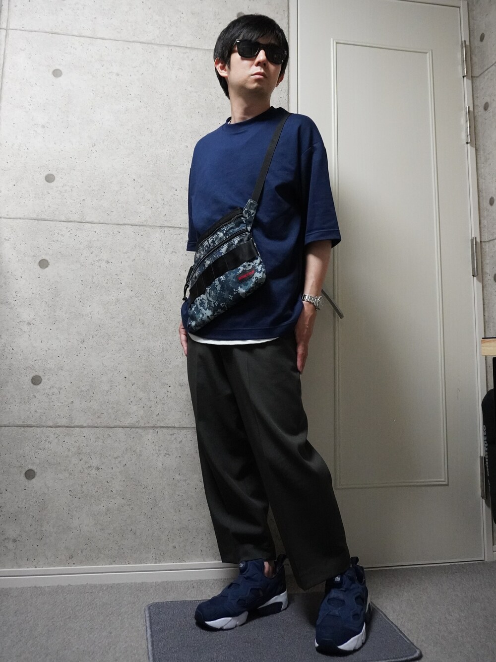 ネイビーTシャツにグレースラックスを合わせました。ちょっと重い色が多いので白タンクトップを少し出すよう調整しています。 デジカモのサコッシュでインパクト出しつつ、ハイテクスニーカーで少し外した感じです。