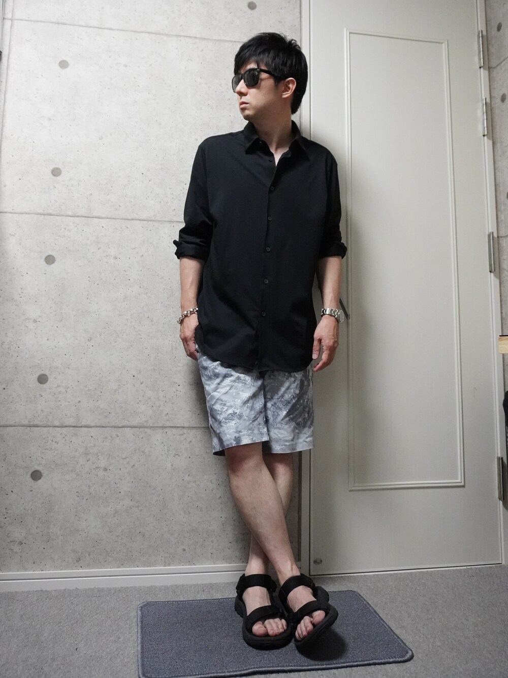 黒シャツに柄の入ったショートパンツを合わせました。 黒シャツのドレスすぎ感をショートパンツとサンダルで崩した感じです。 アクセントにシルバーブレスをしています。