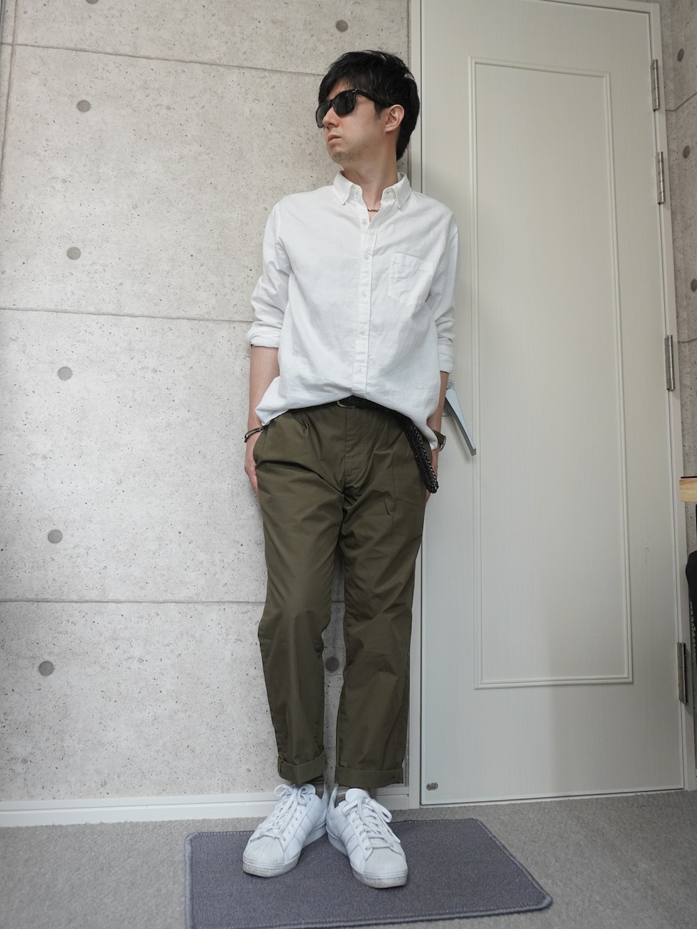 リネンブレンドの白シャツにテーパードのスラックスを合わせたシンプルコーデです。シャツ+スラックスのキレイ目に、白スニーカーで少し外した感じです。アクセントでタックインしています。