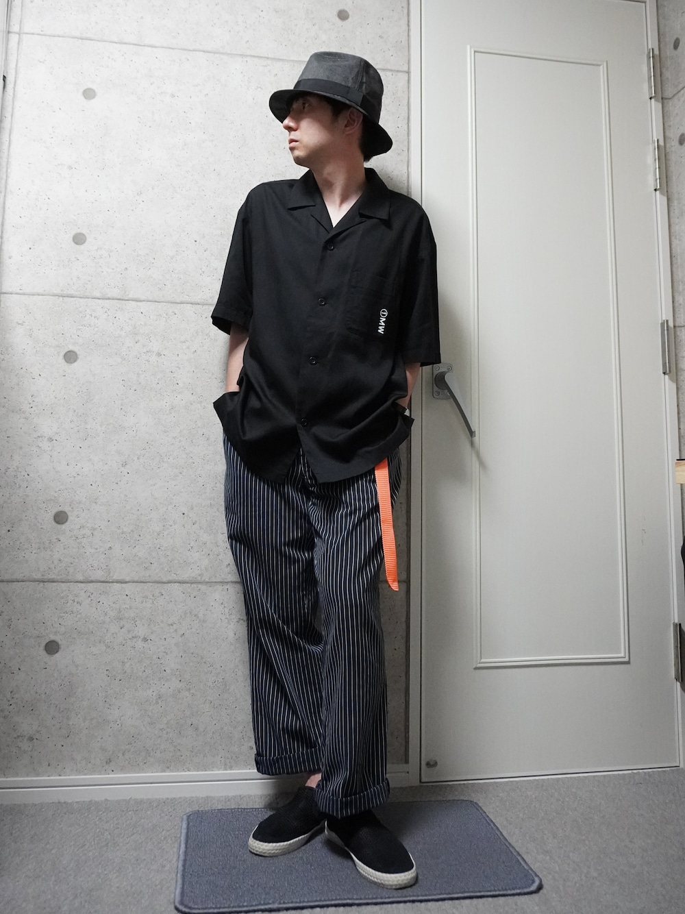 古着のストライプパンツにオープンカラーシャツを合わせました。 全身ダークトーンでオレンジのテープベルトをアクセントにしています。