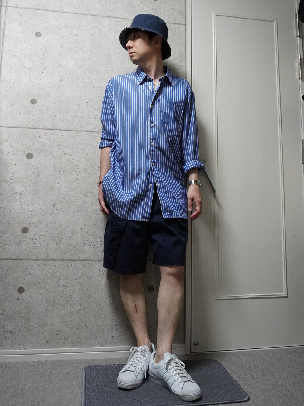 ブロードシャツに古着のカーゴショートパンツを合わせました。全体ブルー系で、アクセントに白スニーカーを履いています。