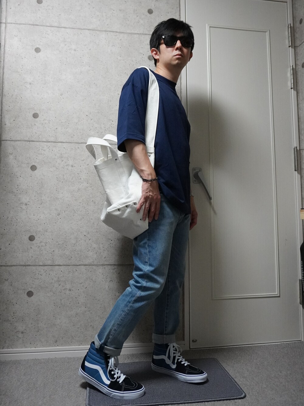 ネイビーTシャツにテーパードデニムを合わせました。 全体をブルー系で統一して、アクセントに白のトートバック持ちました。