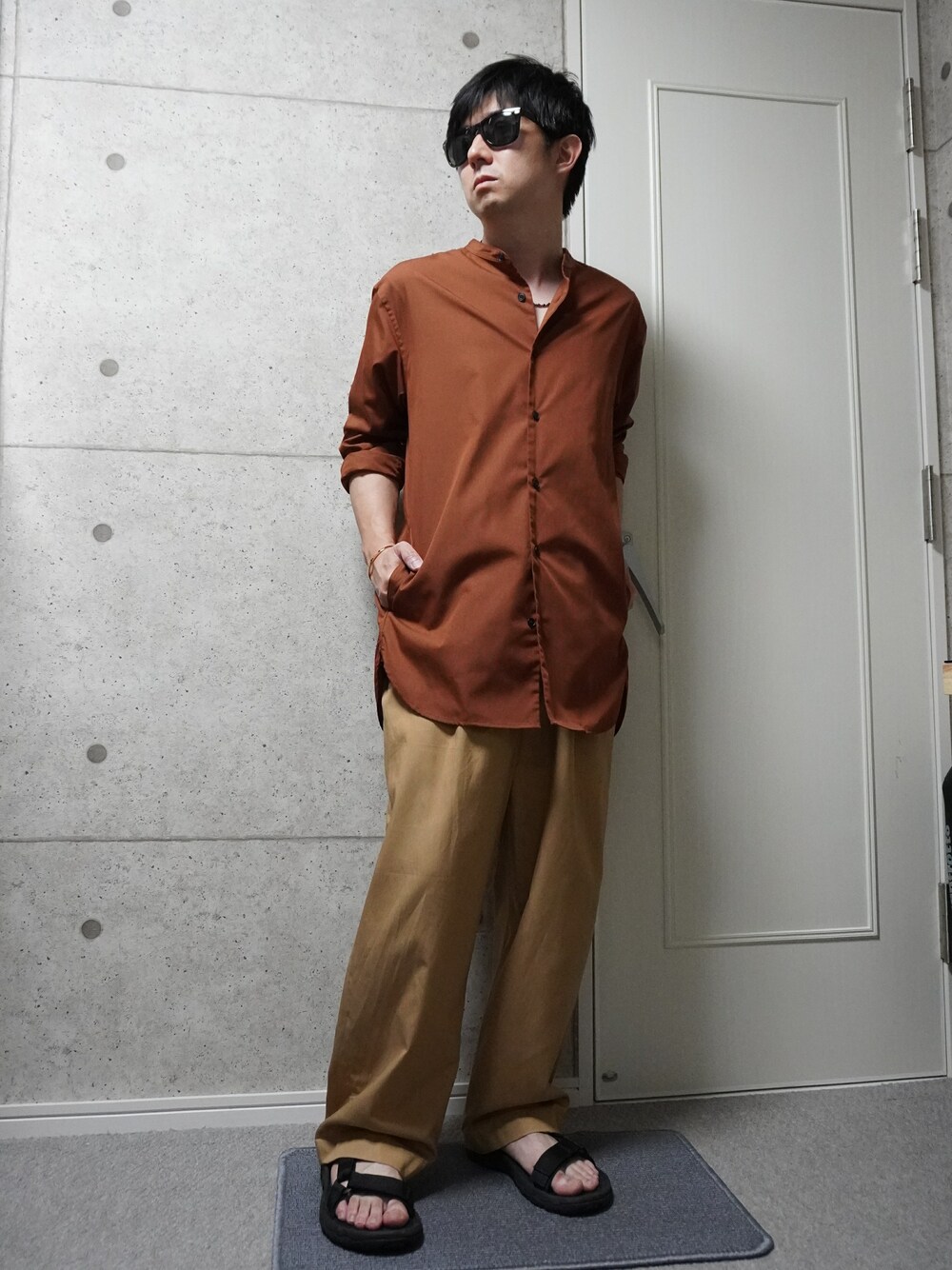 バンドカラーシャツにワイドパンツを合わせました。 上下とも大きいけど、テロテロの素材なので、意外とすっきりまとまったと思ってます。 シャツにポケットがあるのが気に入っています。