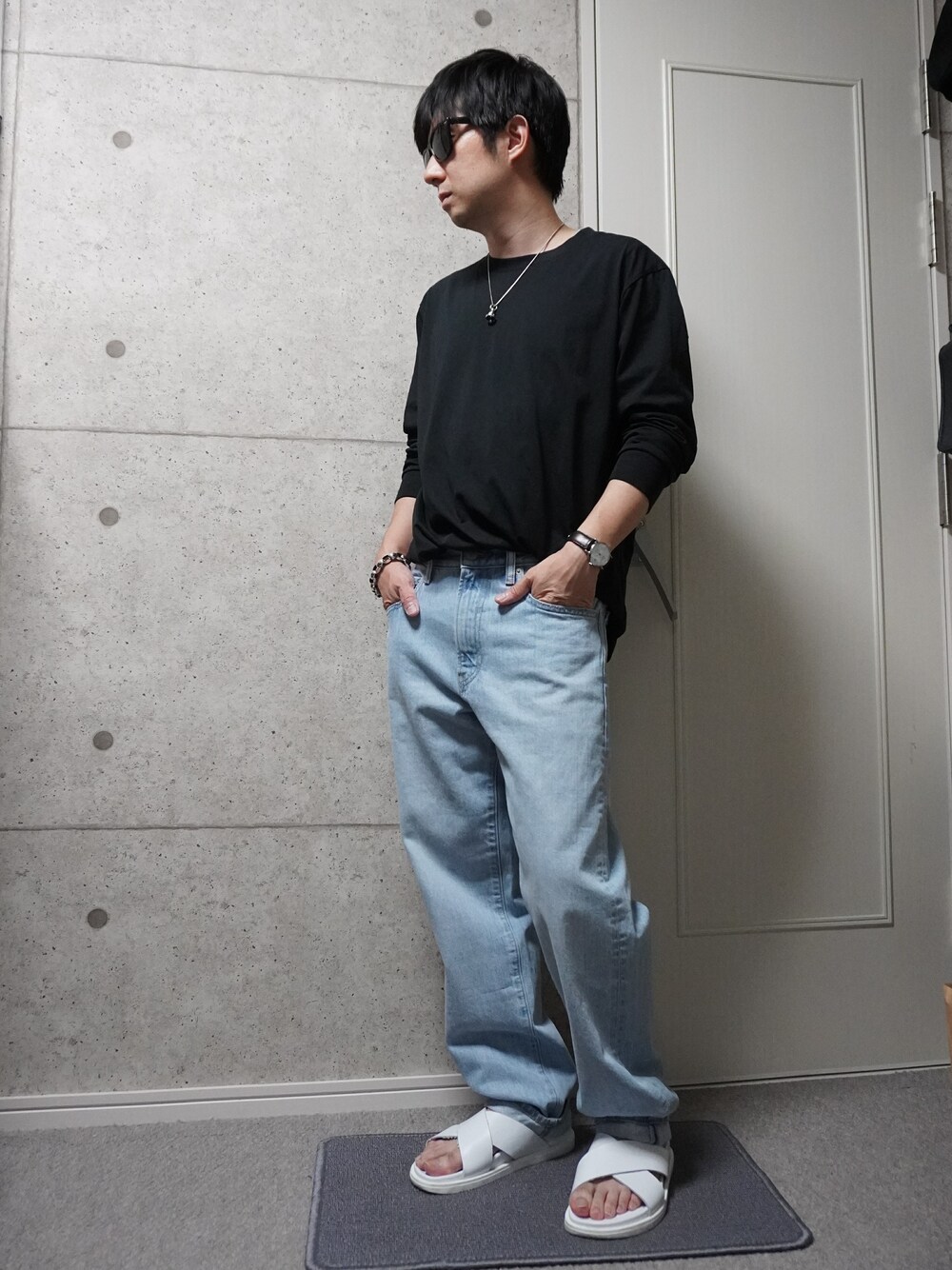 黒のロンTに色落ちデニムのシンプルコーデです。 ロンT大きめだけど、黒とタックインと袖まくりでコンパクトに。デニムは腰履きで裾もルーズな感じにして、全体をAラインっぽくした感じです。 アクセントにシルバーアクセつけています。