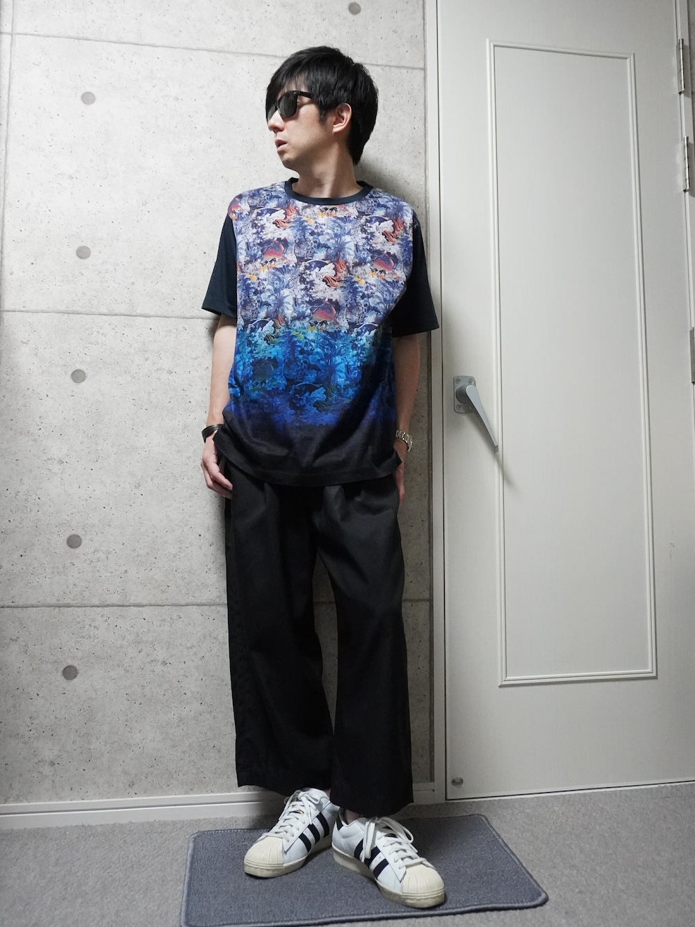 インパクトのあるプリントTシャツにワイドパンツを合わせました。 上下のダークトーンをスニーカーで崩した感じです。