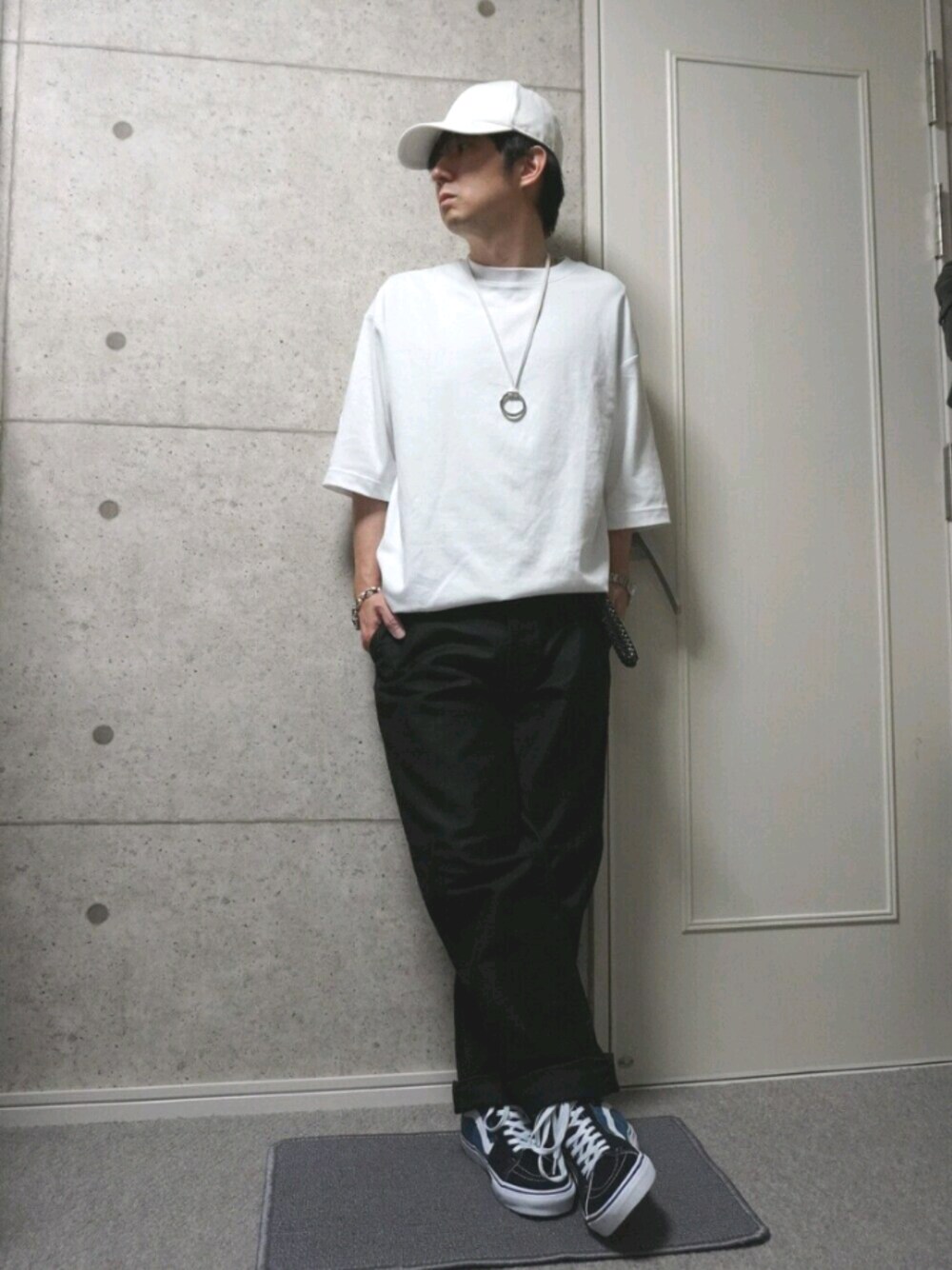 オーバーサイズの白Tにワークパンツとスニーカー&キャップを合わせて、ストリートっぽくしてみました。 子供っぽくならないように、スニーカー以外はモノトーン、ベルトをレザーにし、Tシャツはタックインしています。 アクセントとして、ネックレスにキーストラップをつけました。