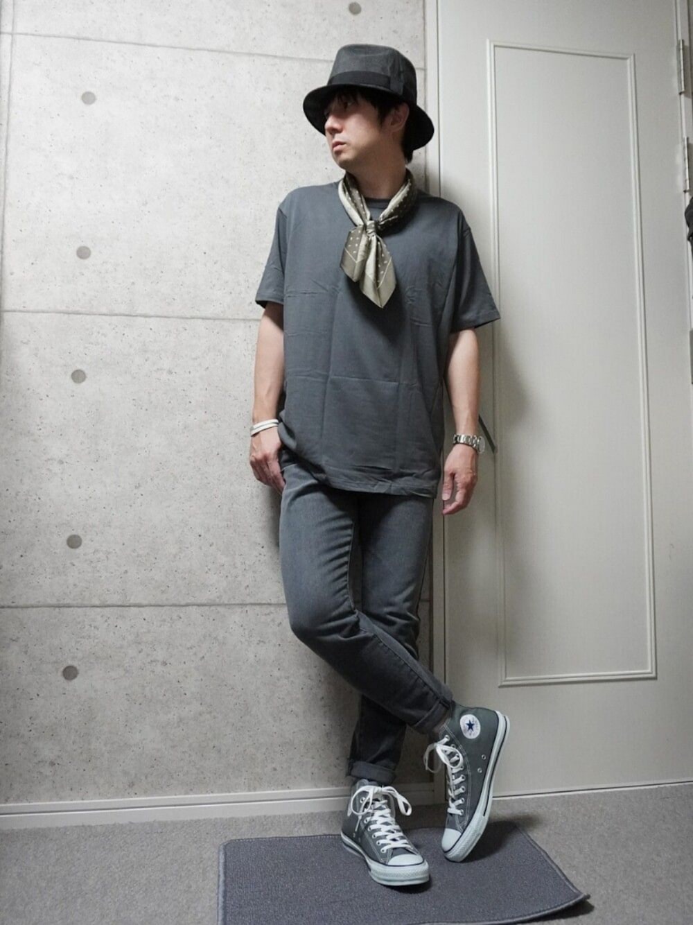 グレーのTシャツにグレーのテーパードデニムを合わせたワントーンコーデです。 デニムにTシャツ、スニーカーでカジュアルな分、ハットにスカーフとワントーンで大人っぽくしてバランスをとった感じです。
