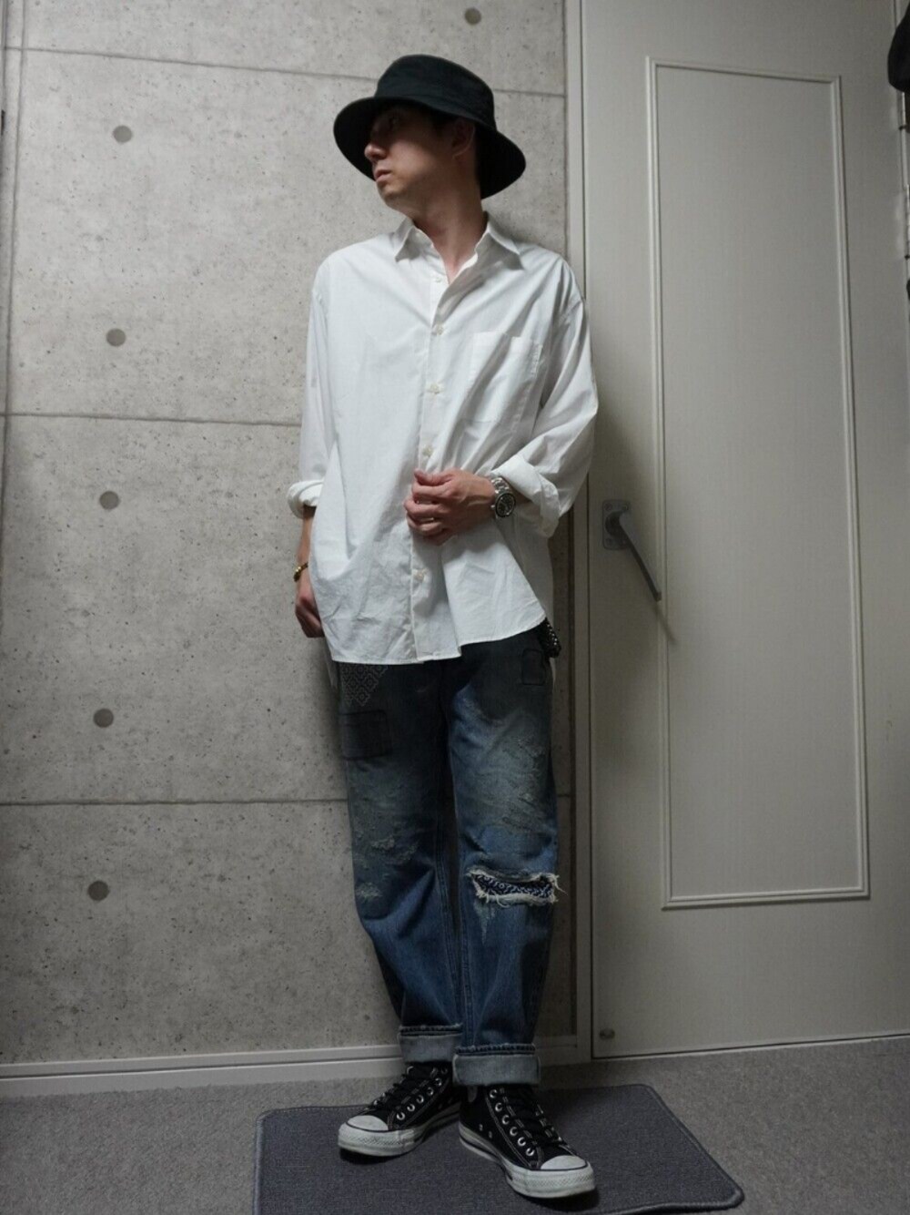 白シャツにジーンズのシンプルコーデです。 クラッシュ加工デニムのヤンチャ感を白シャツでバランスをとりつつ、ハットとスニーカーの黒で締めた感じです。
