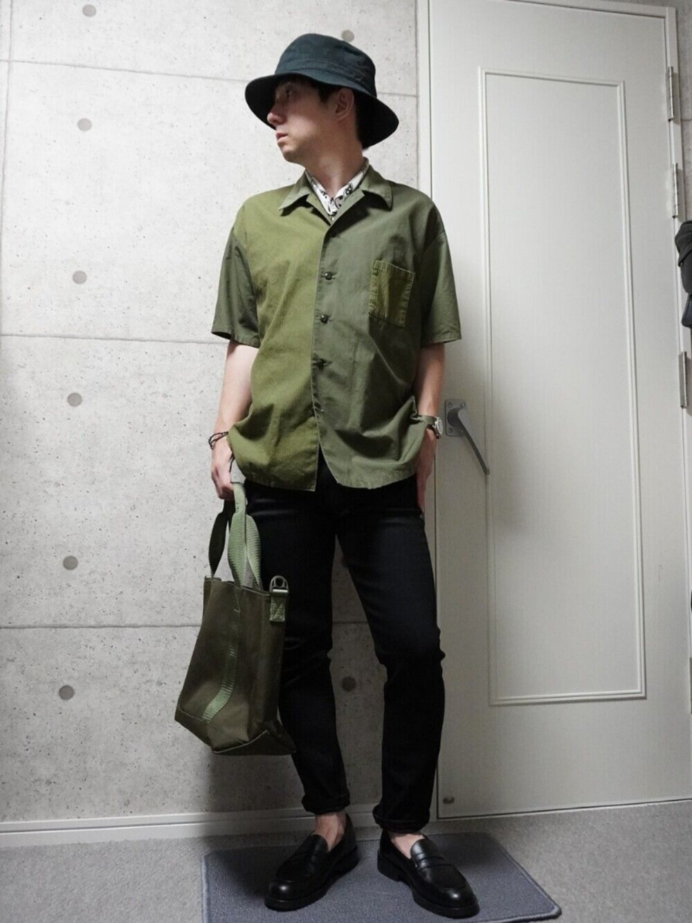 ミリタリーシャツにスキニーを合わせました。ミリタリーシャツに切り替え等があってゴチャゴチャしている分、下半身は黒でまとめてバランスをとった感じです。 アクセントにスカーフを巻いています。