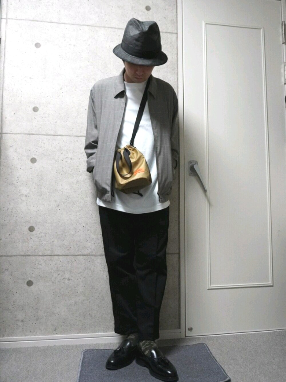スイングトップにテーパードのチノパンを合わせました。 スイングトップのクラシカル感が強いので、大きめの白Tとナイロンの巾着バックで緩和しつつ、下半身の黒とハットで締めた感じです。