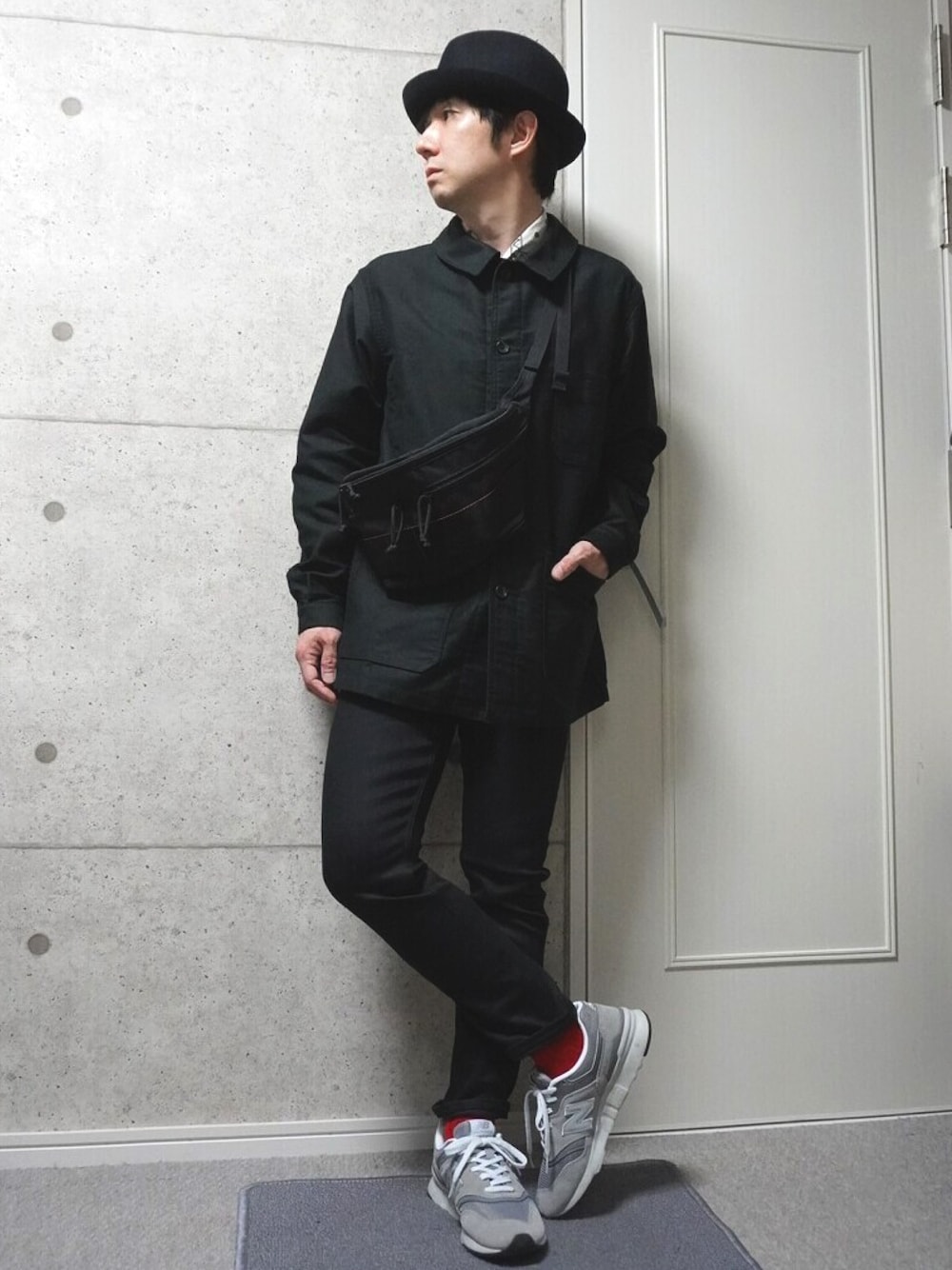 ワークジャケットにスキニーデニムを合わせたブラックコーデです。 シルエットはパンツが細めでゆる目のYライン、 ワークにデニムの合わせだけど、上下ブラックとハットで大人っぽく、 スカーフと赤ラインのあるナイロンバックをアクセントにして、スニーカーとソックスで外した感じです。