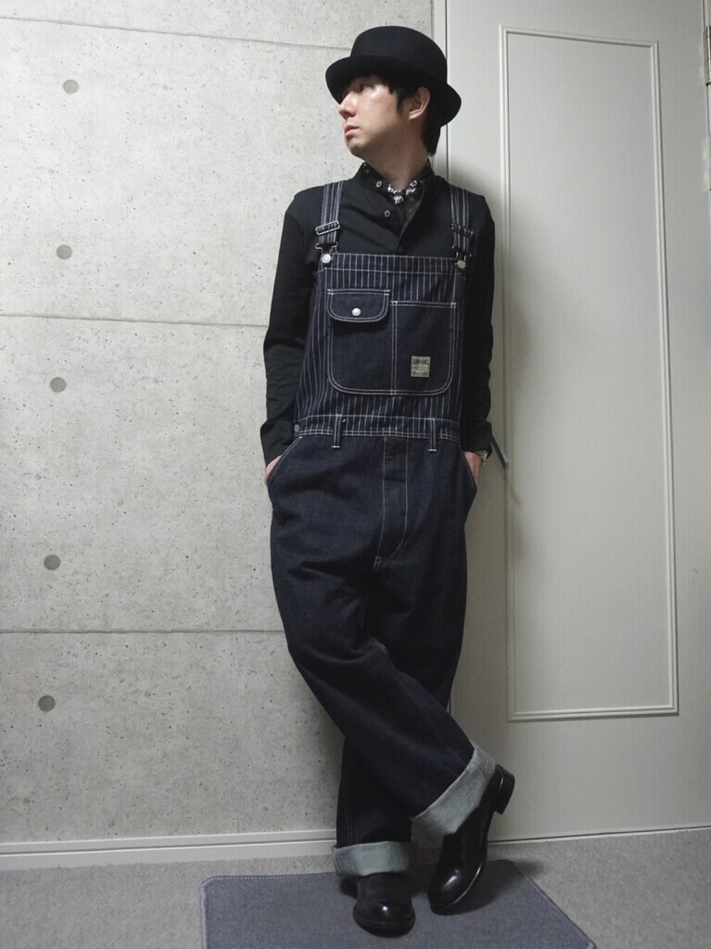 プルオーバーシャツにオーバーオールを合わせました。 シルエットはプルオーバーシャツジャストサイズにオーバーオール大きめでAライン、 オーバーオールの子供っぽさを緩和するために、オーバーオール以外は黒で締めました感じです。