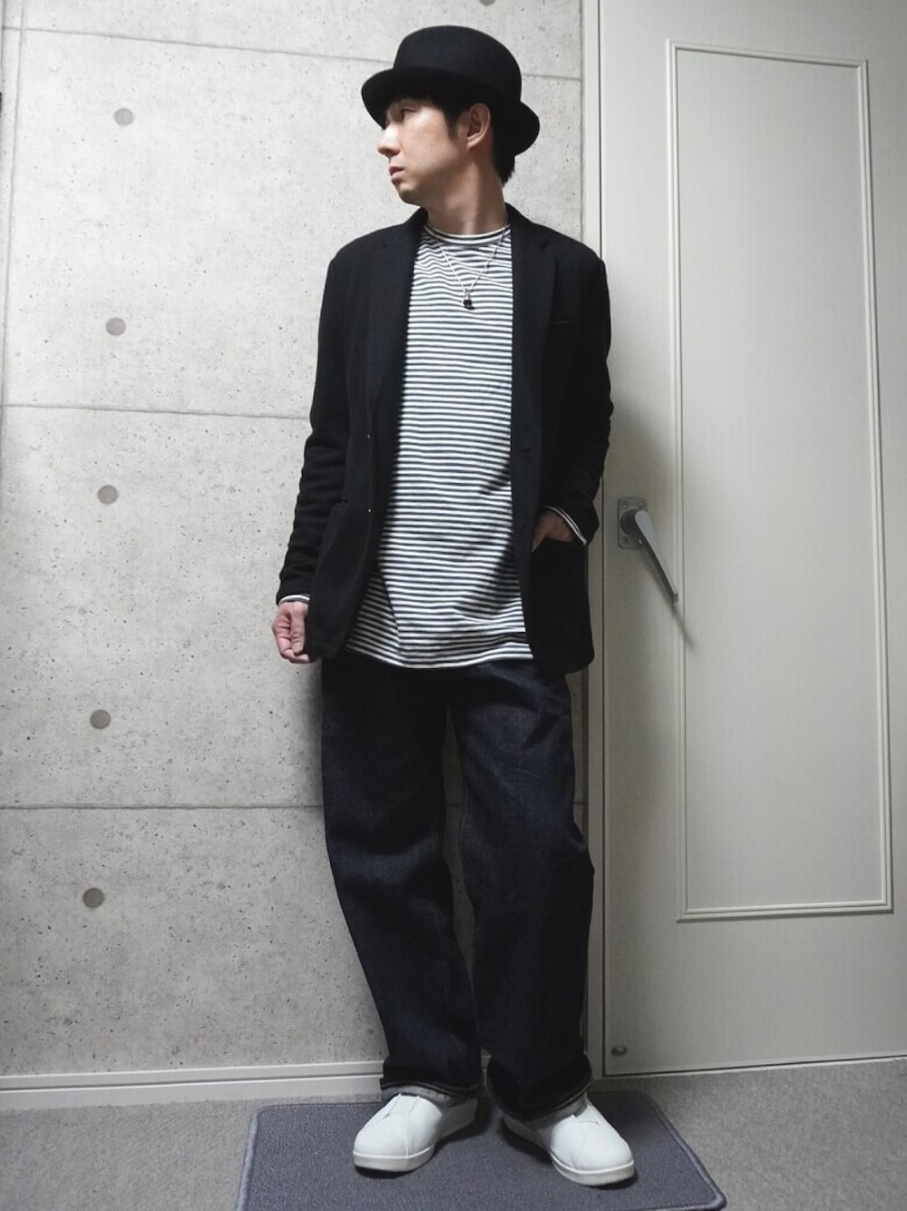 テーラードジャケットにワイドデニムを合わせました。 シルエットは、ジャケットがジャストサイズ、デニムはワイドでAライン、 ハットとジャケットのキレイめを、ワイドデニムで崩した感じです。