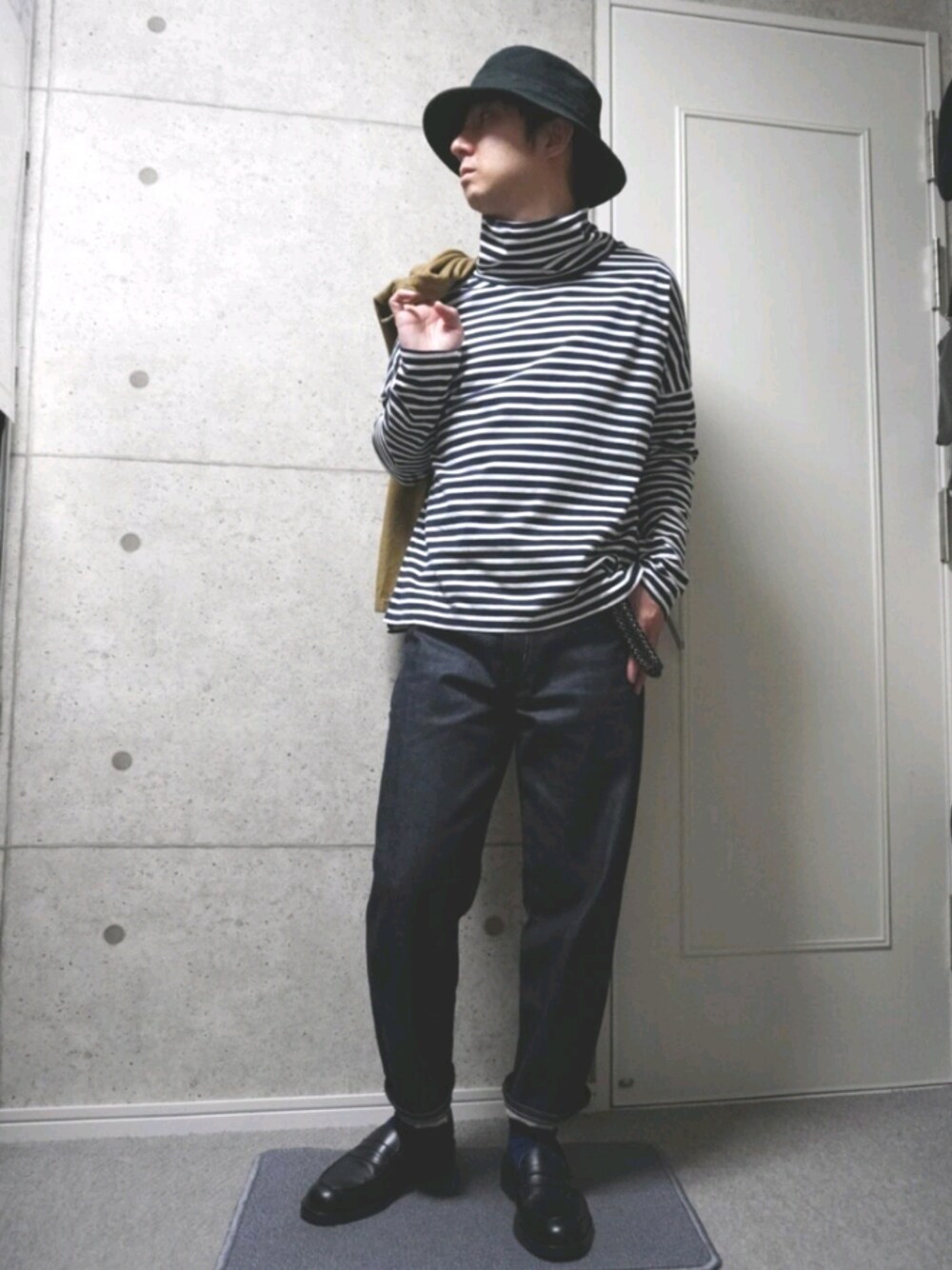 タートルの長袖ボーダーにストレートデニムを合わせました。 シルエットはボーダーがワイドデザインで緩いYライン、 ボーダーとデニムのカジュアルコンビをハットと革靴でバランスとった感じです。
