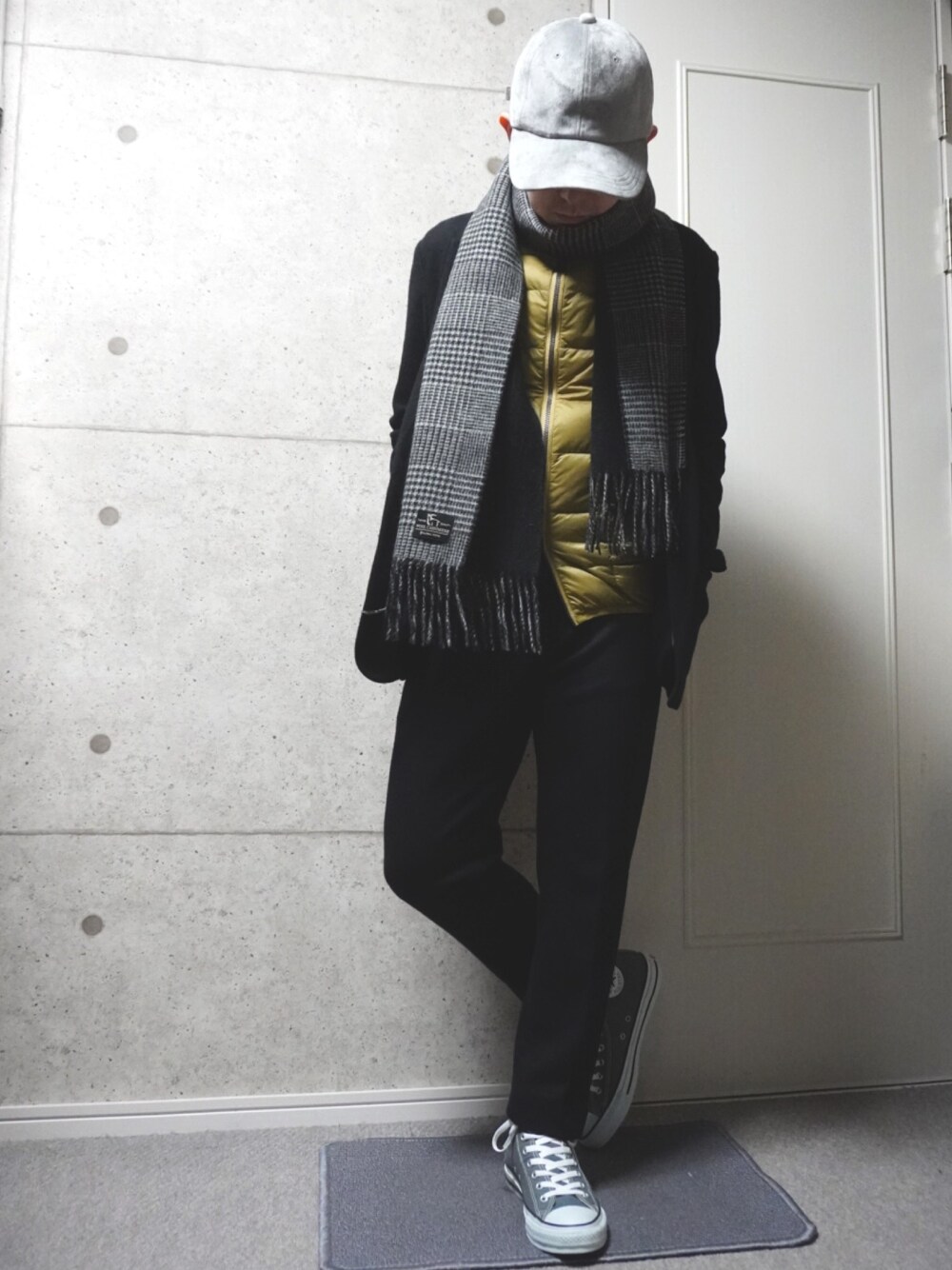 セットアップにインナーダウンを合わせました。 シルエットは上下ジャストサイズでIライン、 黒のセットアップをインナーダウンのイエロー、キャップ、スニーカーで崩した感じです。