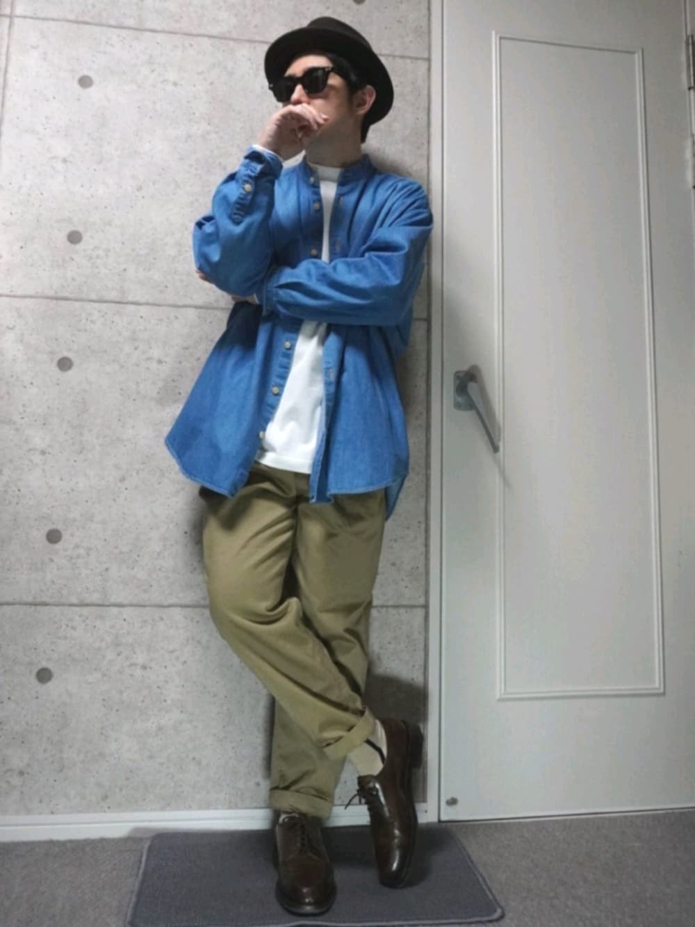 ロングのデニムシャツにチノパンを合わせました。 シルエットはシャツ大きめでYライン、 上下カジュアルアイテムのふわっと感をハットと革靴で締めた感じです。