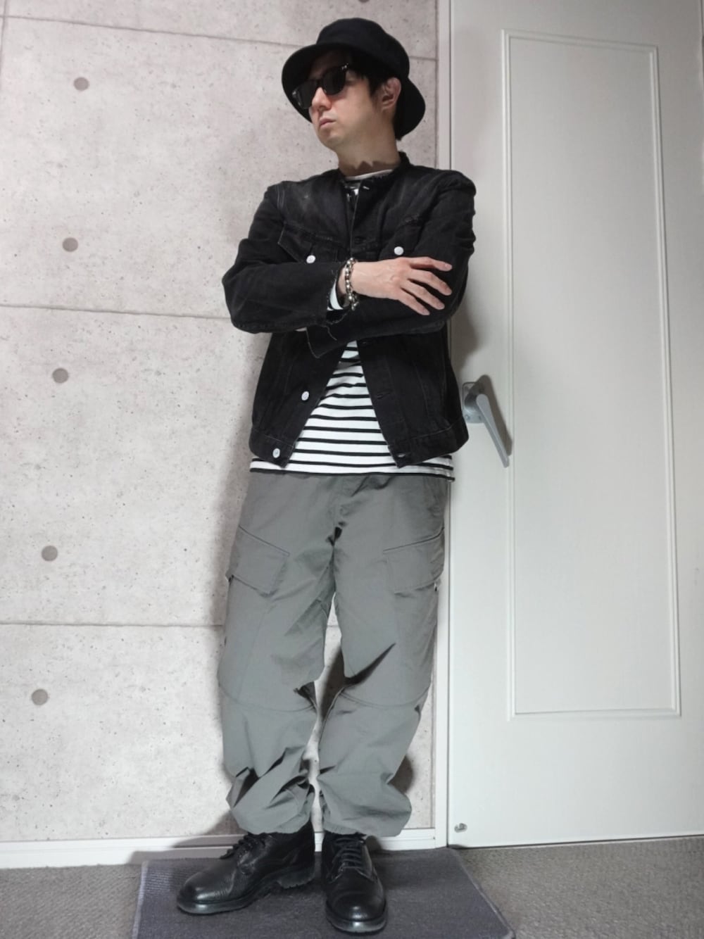 リメイクしたデニムジャケットにカーゴパンツを合わせました。 シルエットはジャケットジャスト、パンツワイドでAライン、 デニム、ボーダー、カーゴパンツでカジュアルな分、全体モノトーンにハットと革靴でバランスとった感じです。