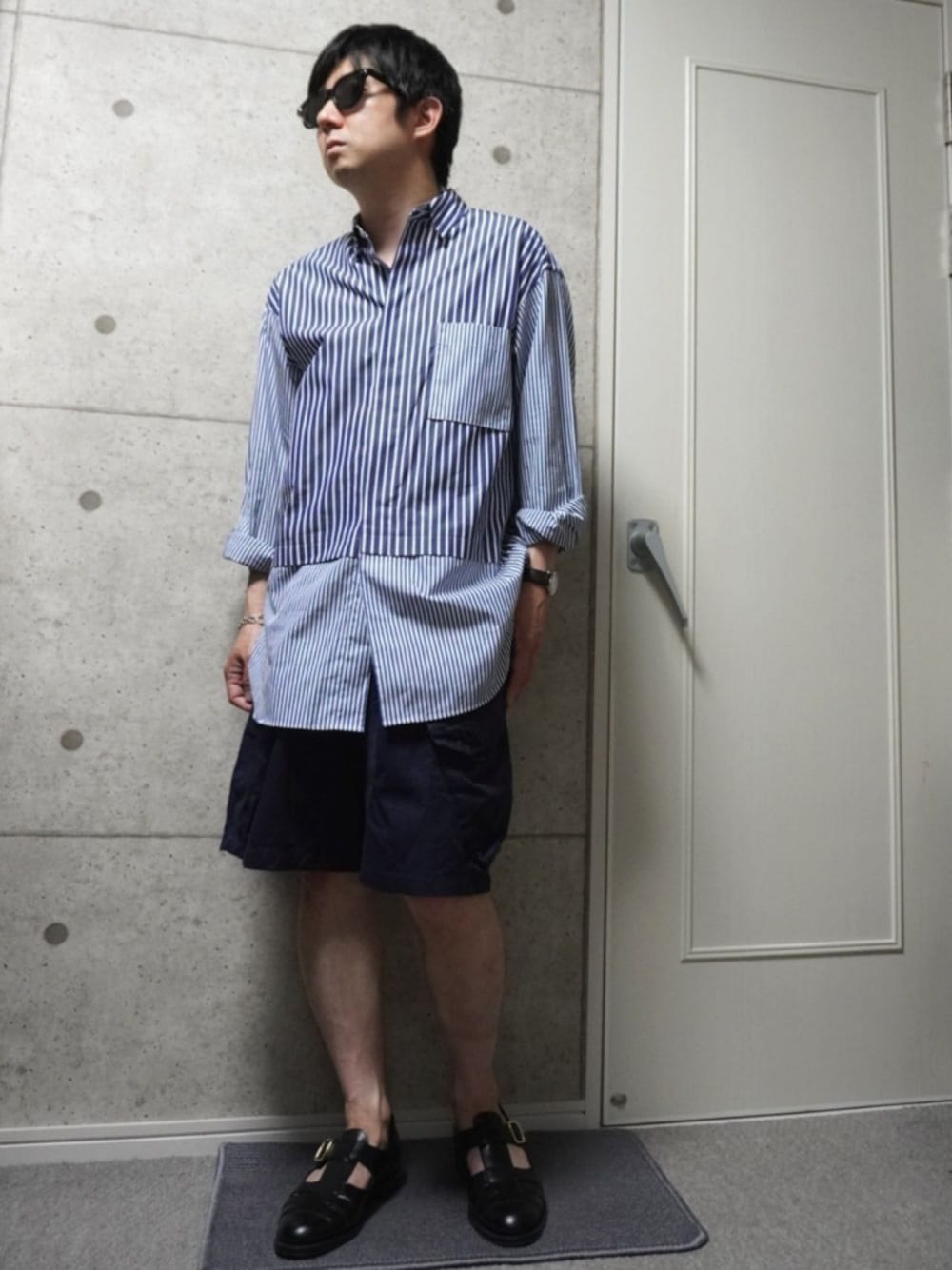 ストライプシャツにカーゴショーツを合わせました。 シルエットはシャツオーバーサイズにショートパンツでYライン、 カーゴショーツがカジュアルな分、レザーサンダルでバランスとった感じです。