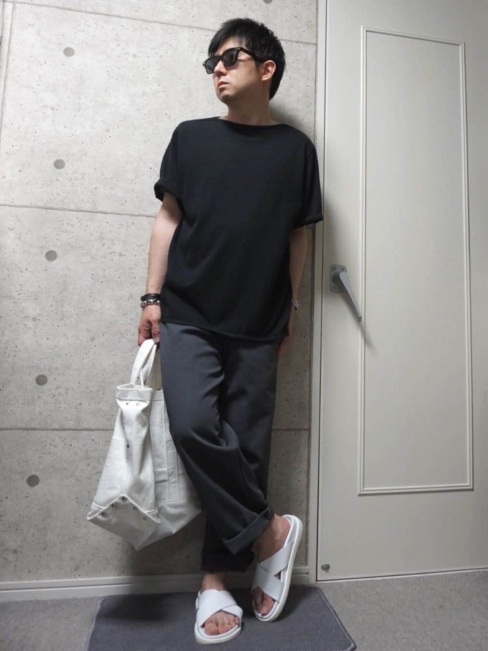 半袖ニットにワークパンツを合わせました。 シルエットは上下ともちょいゆったりのIライン、 全体モノトーンとニットで大人っぽく、バックとサンダルの白で軽くした感じです。 アクセントにごつめのシルバーブレスレットをつけてます。