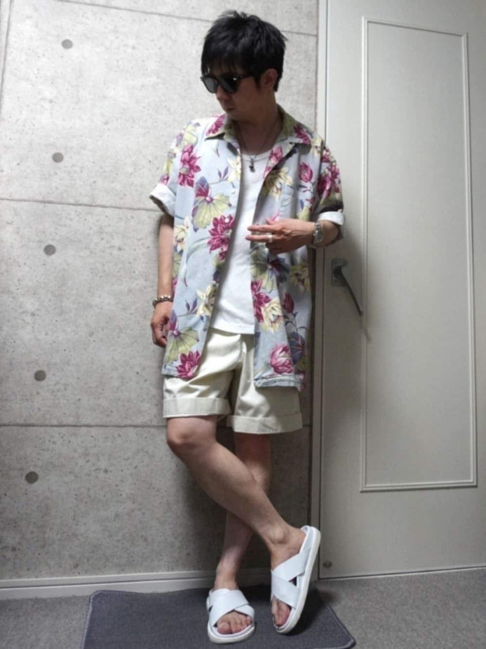 古着のアロハシャツにショートパンツを合わせました。 シルエットはシャツオーバーサイズにショートパンツでYライン、 シャツの花柄をメインに白で合わせて夏っぽく、ゴツめのシルバーアクセとタンクトップで男くささを出した感じです。