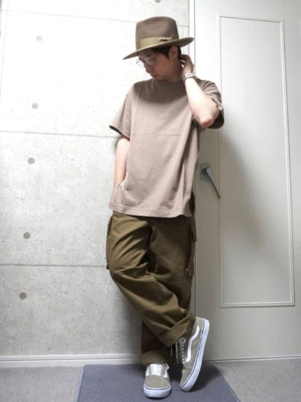 5部袖のロングTシャツにカーゴパンツ合わせました。シルエットは落ち感のあるTシャツとパンツ太めで気持ちAライン、 上下カジュアルですが、全体ブラウンで統一、ハットと渋いサングラスで雰囲気でるようにした感じです。