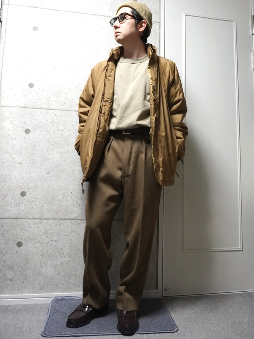 ダウンジャケットにスラックスを合わせたワントーンコーデです。 最終防寒アウターのECWCSレベル7ジャケットなので、中にロンT1枚でいけちゃいます。 上半身はカジュアルな分、下半身はスラックスにローファーできれいめにバランスとった感じです。