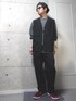ロンTにベストを合わせたモノトーンコーデです。 シルエットを上下緩めにした分、モノトーンできれいめに、 シルバーをアクセントにしつつ、赤いスニーカーで外した感じです。