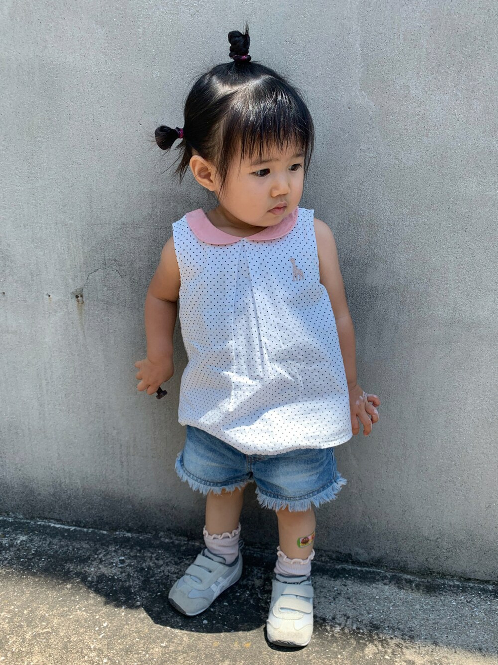 タンクトップタイプのシャツにショートパンツの組み合わせ。 夏らしいコーデにしました。 髪も涼しくサザエさんヘアスタイルでスッキリ。