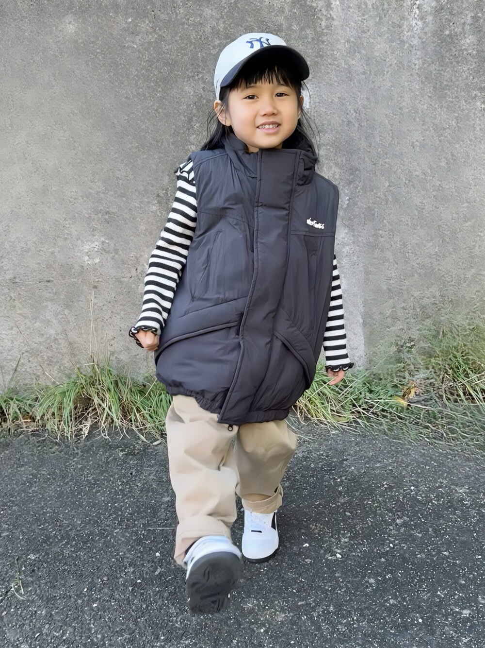ご覧いただきありがとうございます😊 ボーイッシュコーデで公園に行きました。 ダウンベストは袖がないので動きやすく、公園で遊ぶにはもってこいのアイテムです。