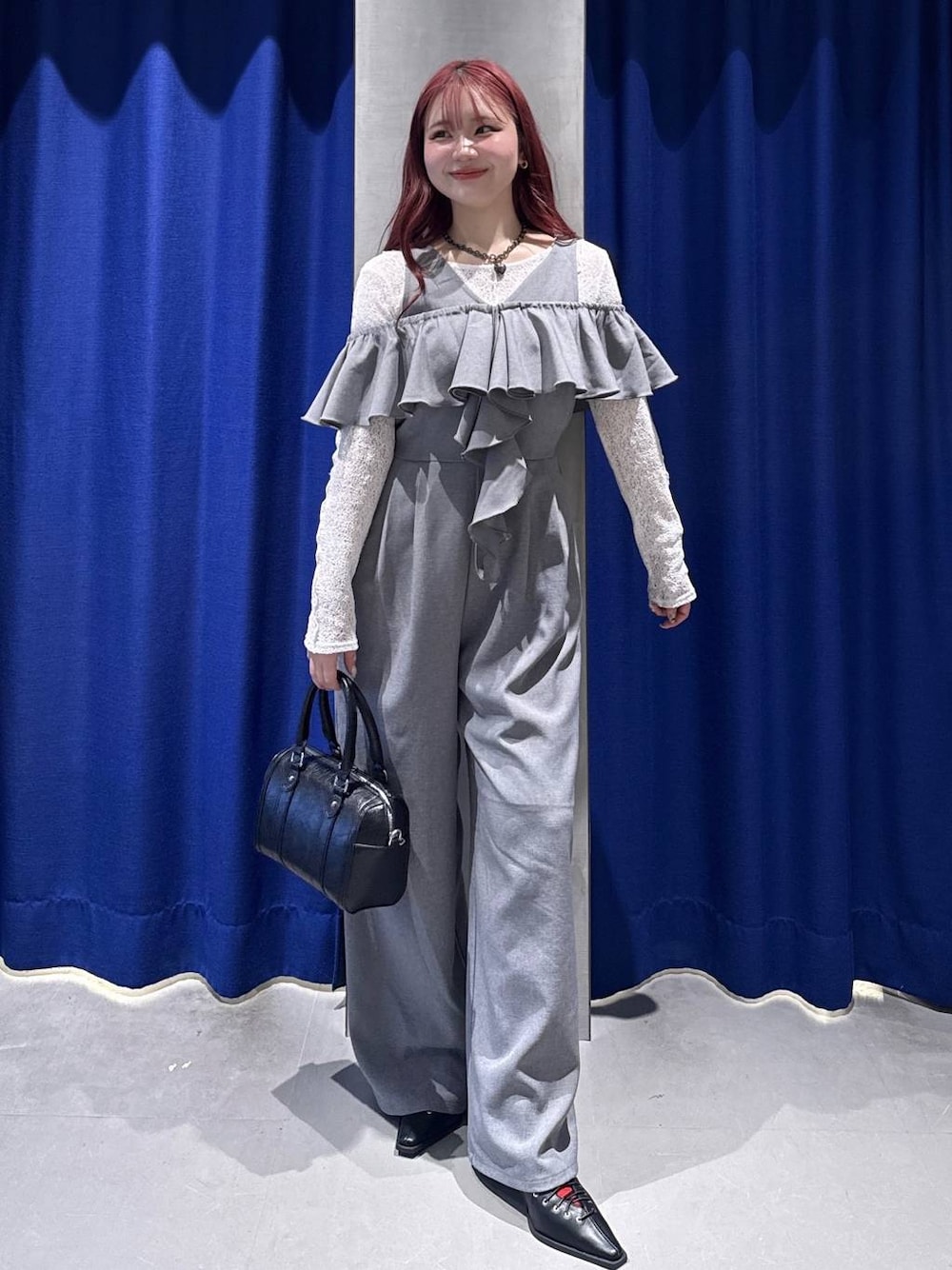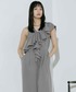 バスケットフリルサロペ🩶 胸元の大きなフリルがかわいいサロペ🪽 後ろのウエスト部分はゴムになっていて着ごこち丸 フリル部分はオフショル風にも着たり そのまま上にしてフリル衿として着ても いろんな着まわしで楽しめるアイテムです🎶🎶