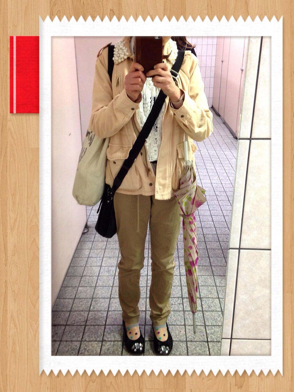 ジャケット…Another Edition ボーダーニット…ラビリンス パンツ、ペタンコ靴…通販 靴下…雑貨屋さん バッグ…アニエスb レーススヌード…SM2