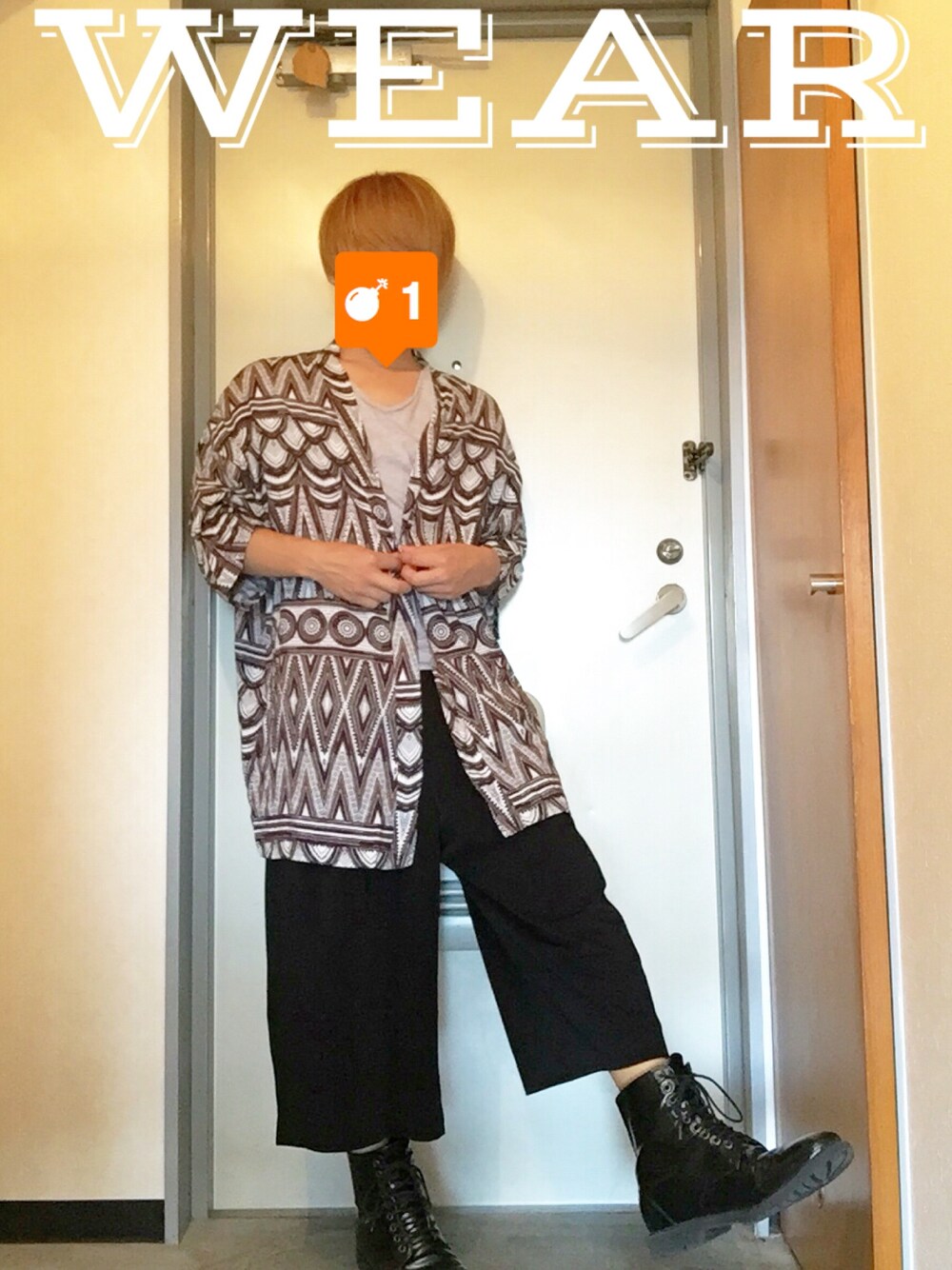 モノトーンめのモードめのゆったりコーデ😳 差し色は、髪色...?笑 全体的にゆったりしたシルエットをブーツでタイトにハズし! 柄物トップスはH&Mのレディース! ワイドパンツは古着。 ブーツはForever21です!👢 風通し!!涼しい!!足は蒸れる!!