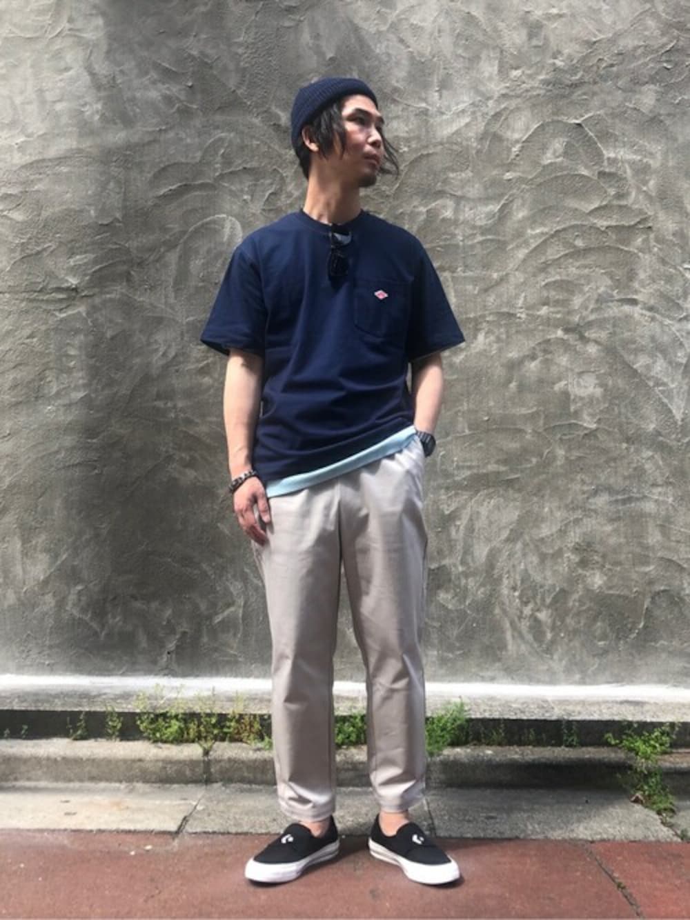 【DANTON/ダントン】C/NポケットTEE 万能なワンポイントロゴTシャツ。 イージースラックスを合わせて程よくクリーンさも意識したコーディネート。 身長:175センチ/ 普段サイズ: L/ 着用サイズ:42 サイズ感: 程よくすっきりとしたサイズ 素材感:しっかりとしたコットン素材感 着心地:サラッと軽い着心地