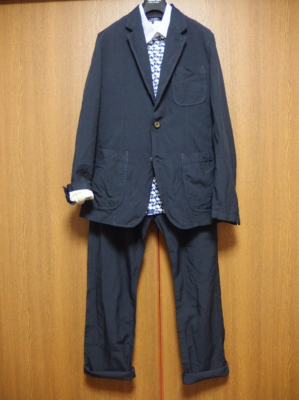 コムデギャルソン オムドゥ 15ss立ち上がりのポリエステル縮絨のセットアップと くじら柄のシャツです。 セットアップはちょうど1年前に購入したもの(過去の日記にあります)とほとんど同じ型ですが、 今回のものは生地の糸が細くてすべすべしてます。