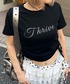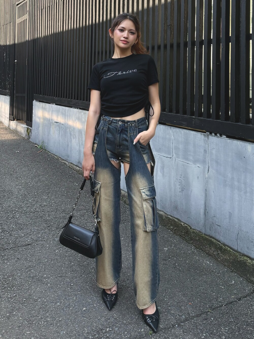 ちびTはピタッとしすぎずボディラインがそんなに出ないので安心して着れました✨ デニムと合わせて今年っぽいy2kコーデで着てみました🖤