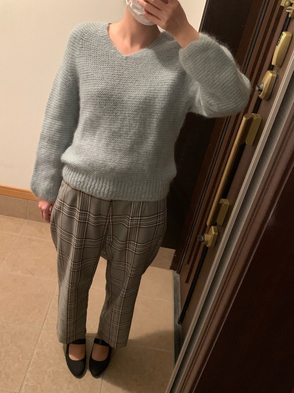 2020.10.27 グレンチェックパンツがベルト付きなので水色ニットをインしたら良かったな。と写真を撮った後に思ったんだけど撮り直す気力がもうなかった。笑
