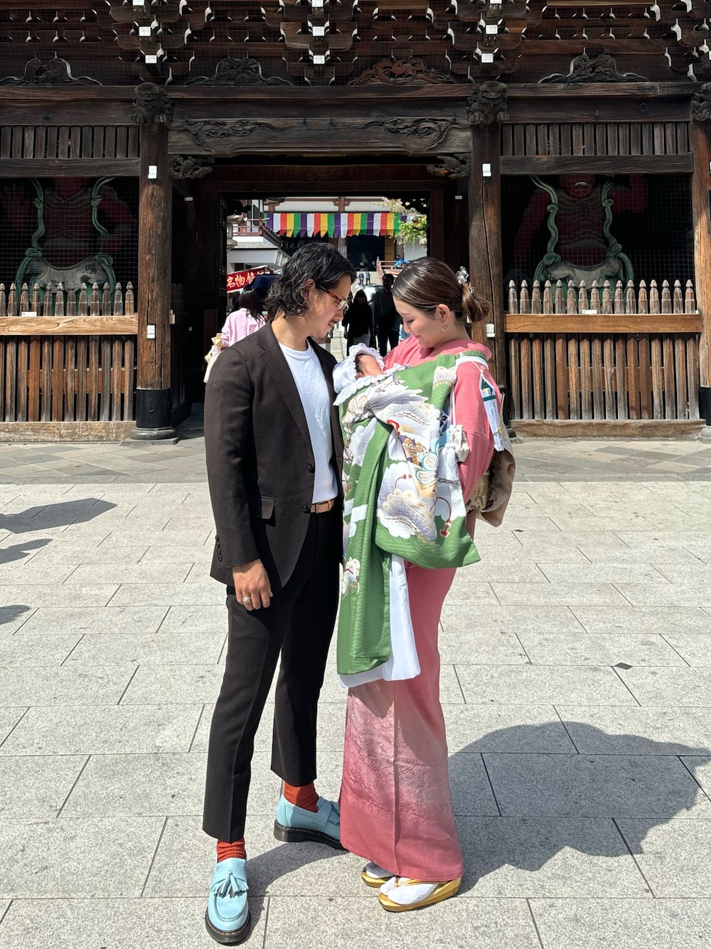 息子の健やかな成長を祈願して御宮参りへ⛩️ パパはローファー、ママは着物、息子は神レベルの可愛さ。 三者三様でも、心は一つ。