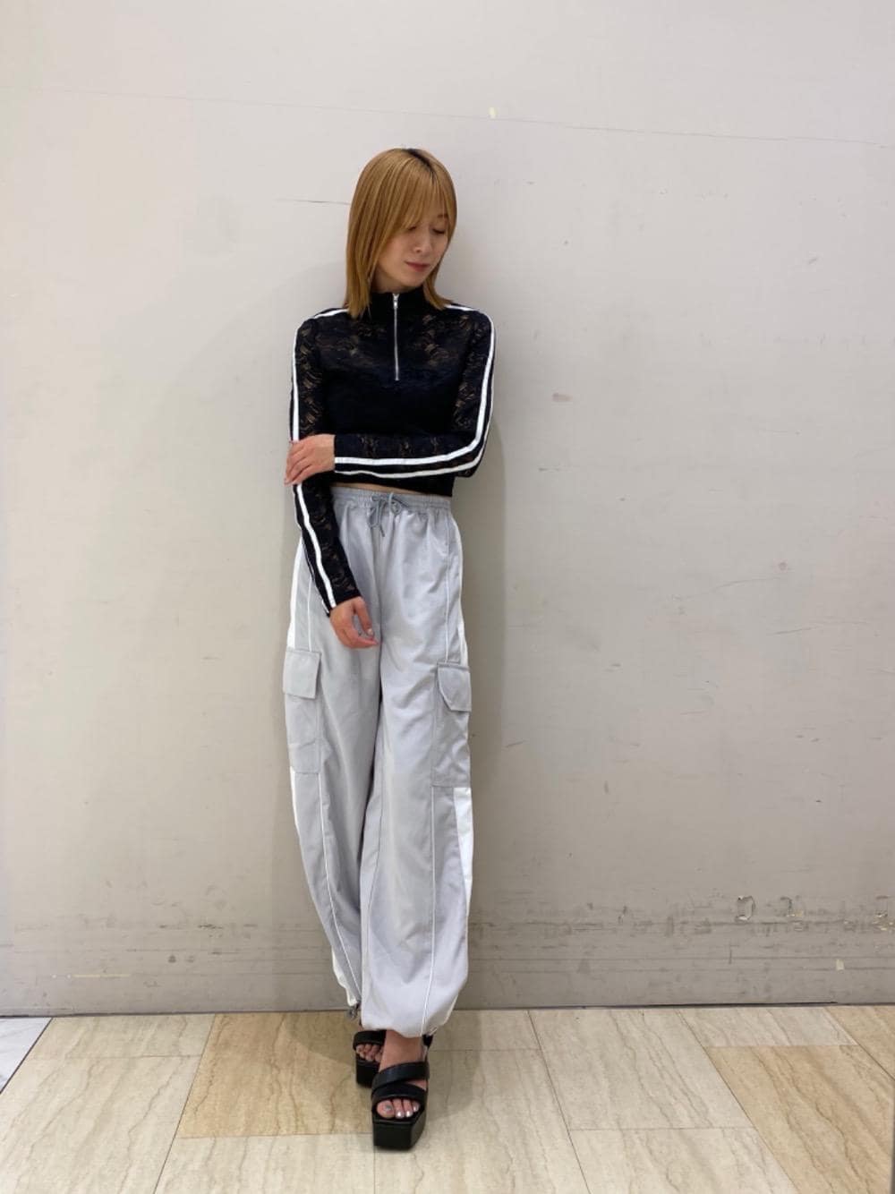 161cm レーストップスはパット付きのインナーも付いてるので、 下着を気にせず楽チン♡ パンツはドロスト仕様で丈間お好みで調整できるので 低身長の方でもスッキリした印象で着ていただけます♪