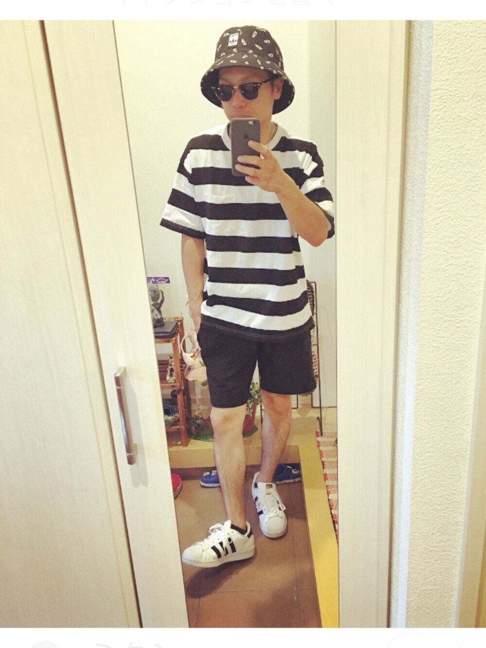 このコーデは2回目です😅 アディダスのバケットハットに黒のレイバン クラブマスターで、モノトーン👣